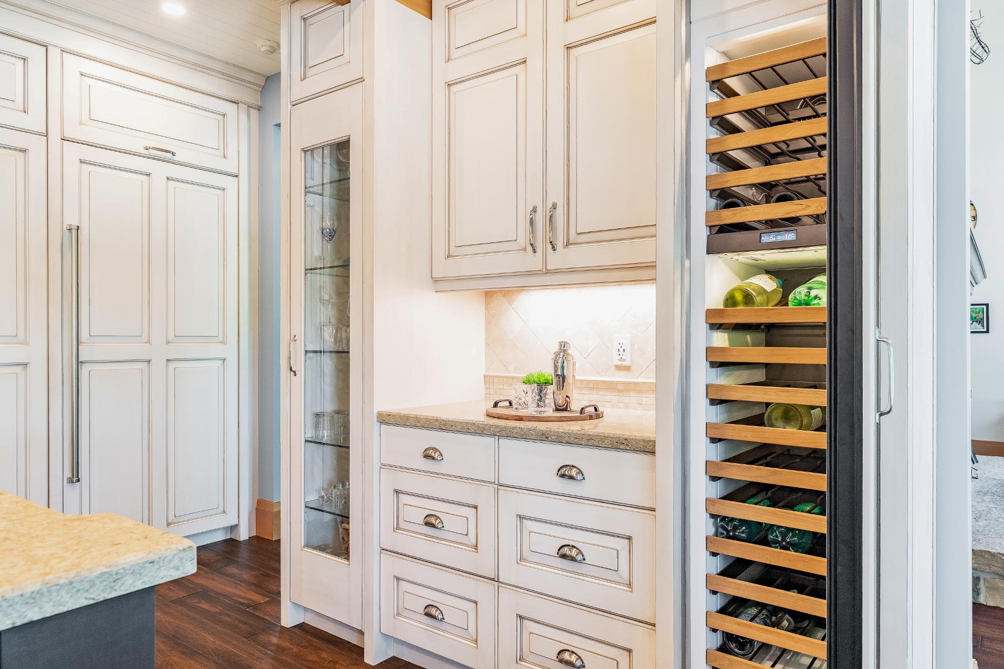 - High-end stainless-steelappliancesincluding a subzero winetower,and fridge and freezer, along with a Wolf gasstove with a built-in hood