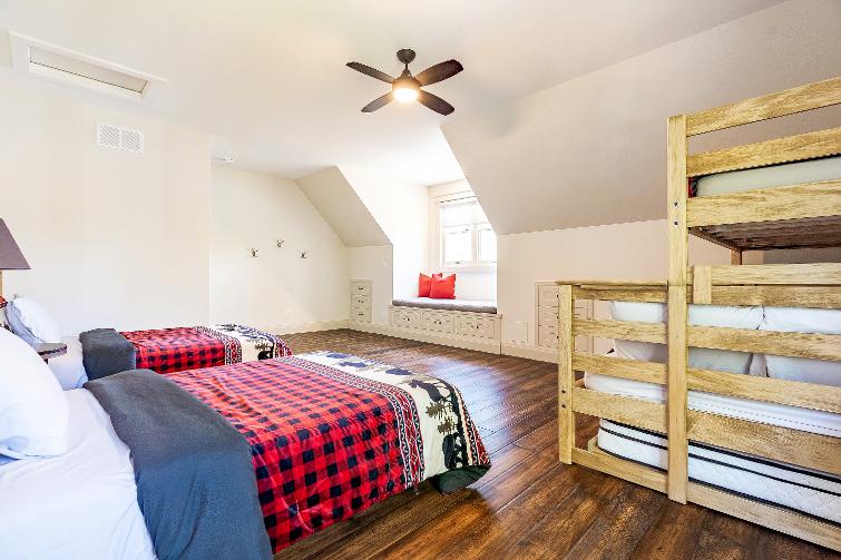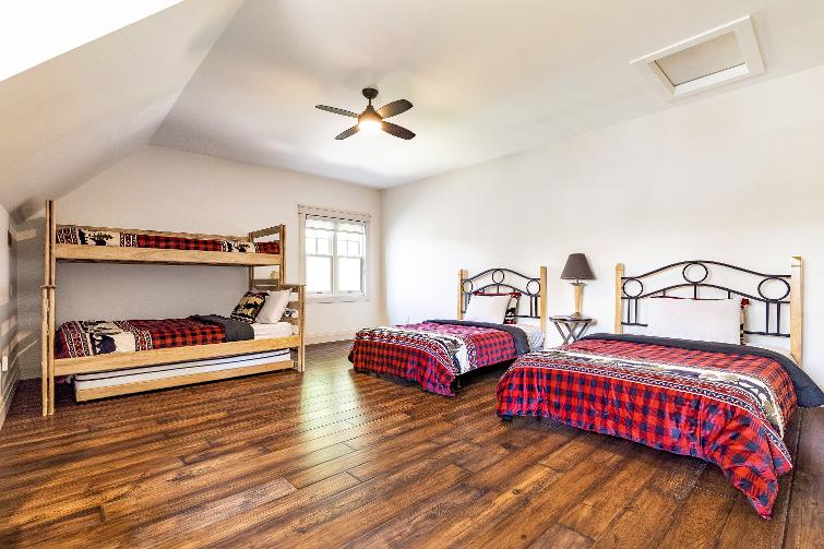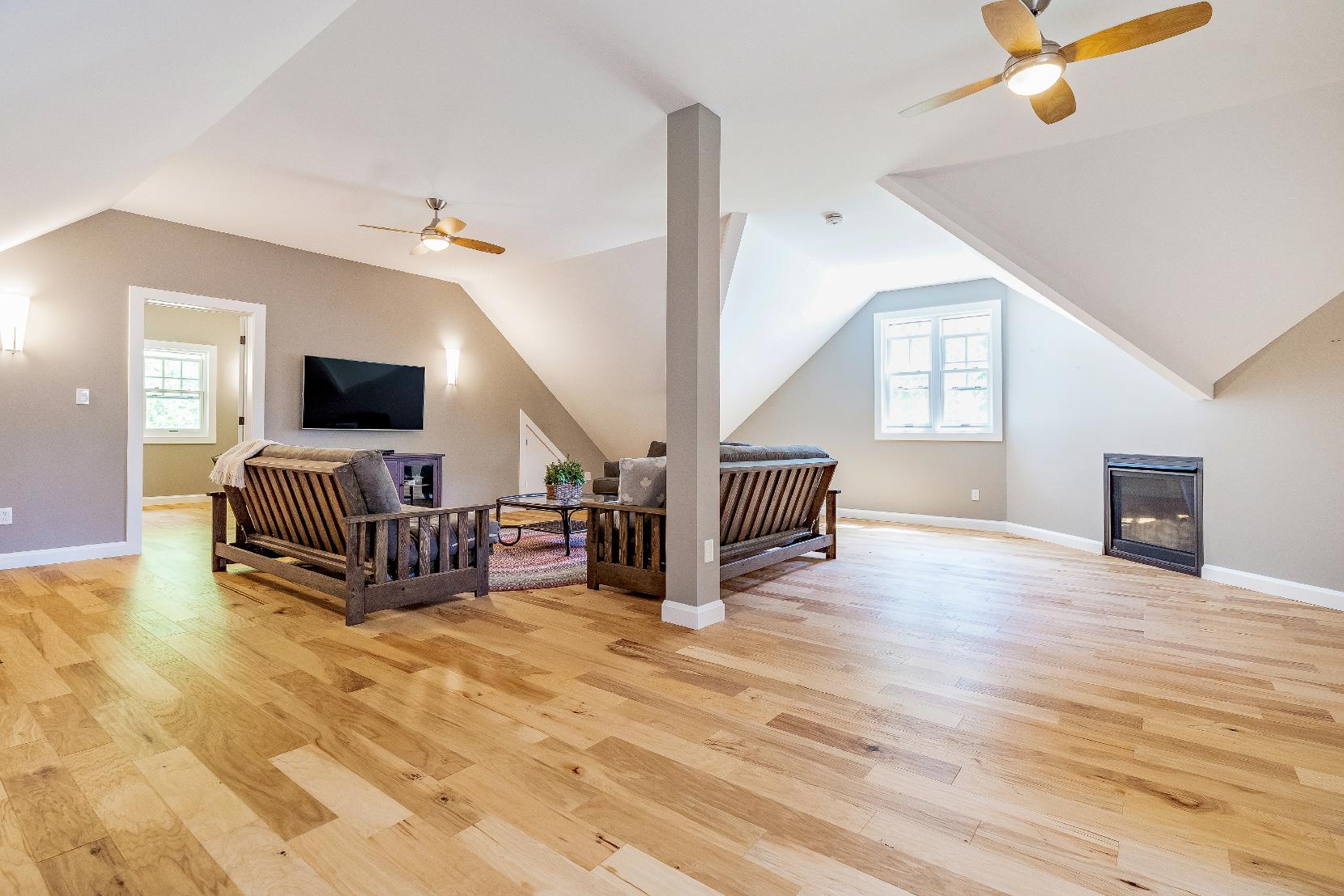 - Vaulted ceiling with two ceiling fans