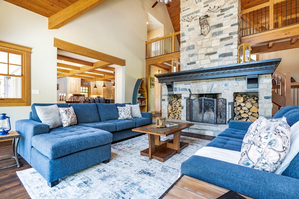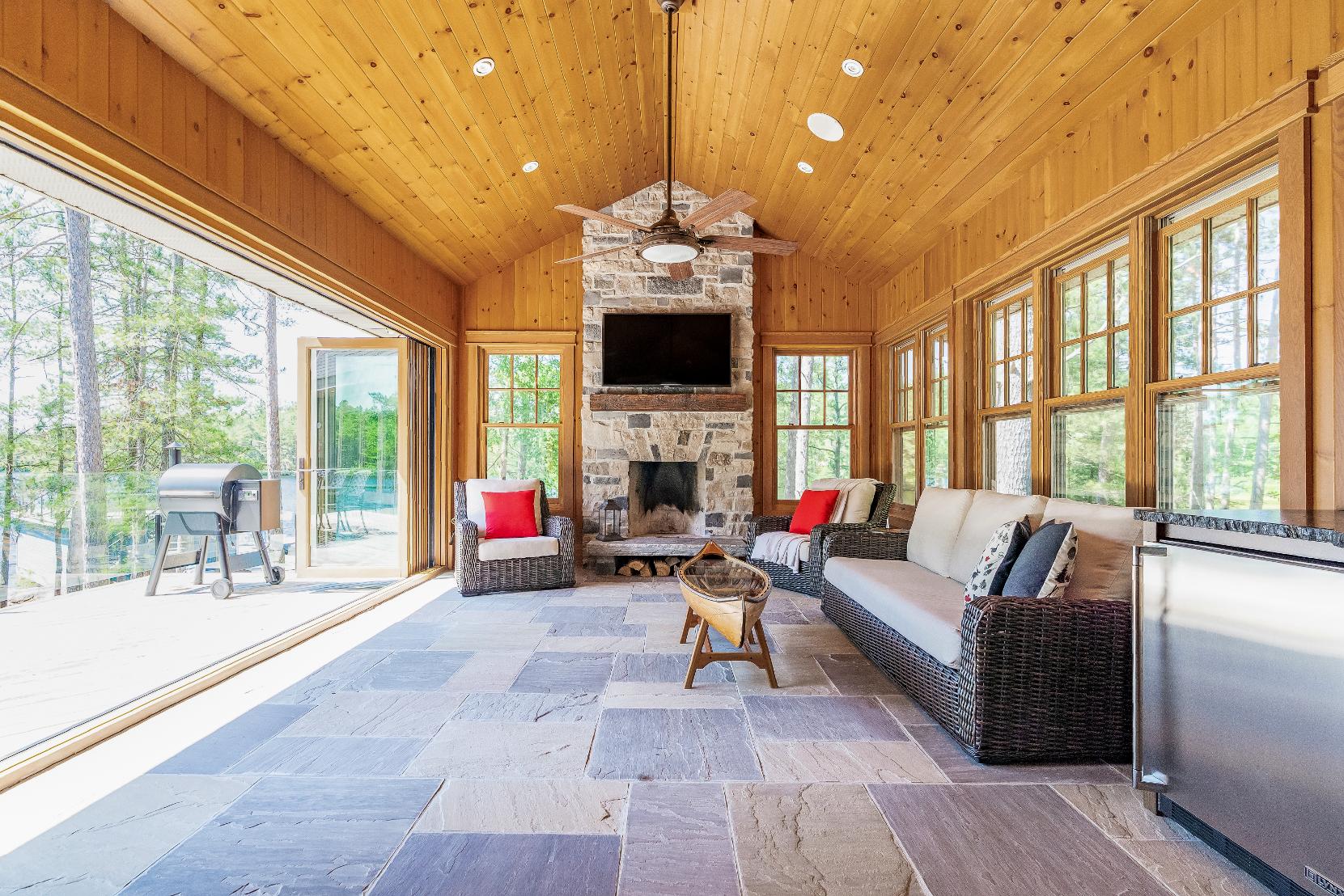 - 23'fireplaceenclosed in a naturalstone surround with a granite hearth