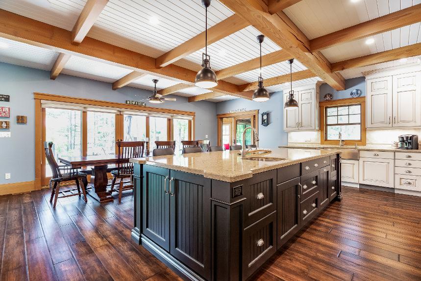 - Paneled ceiling with pinebeam accentsand sleekmodernrecessed lighting
