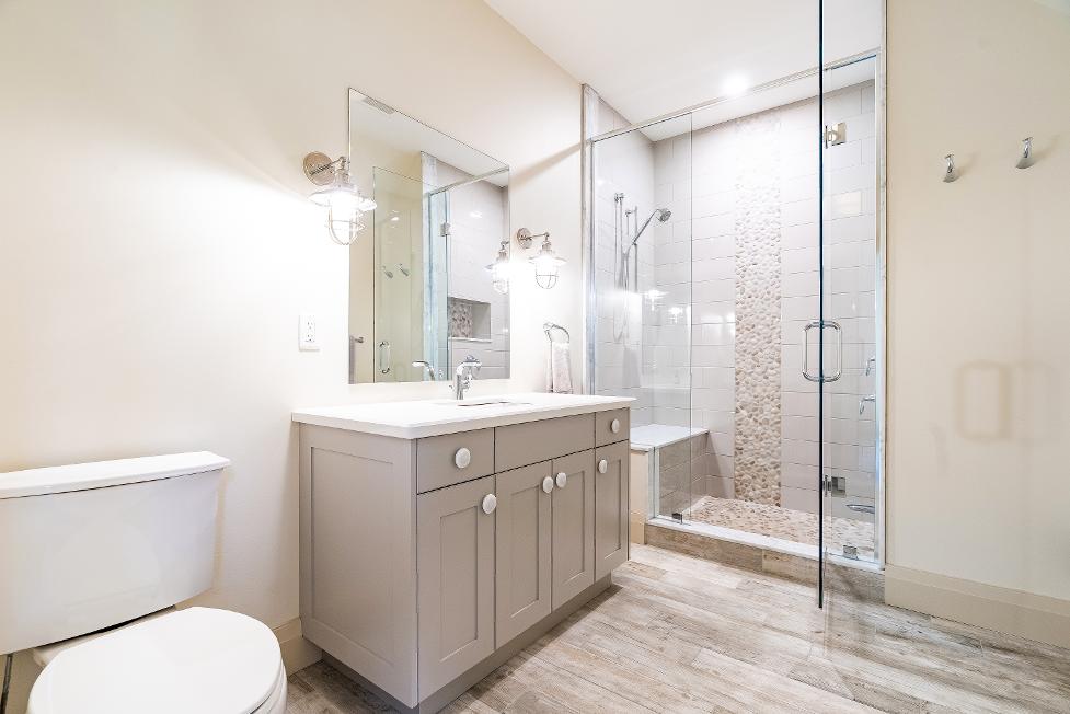 - Glass-walled shower finished with a built-in bench