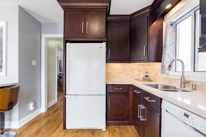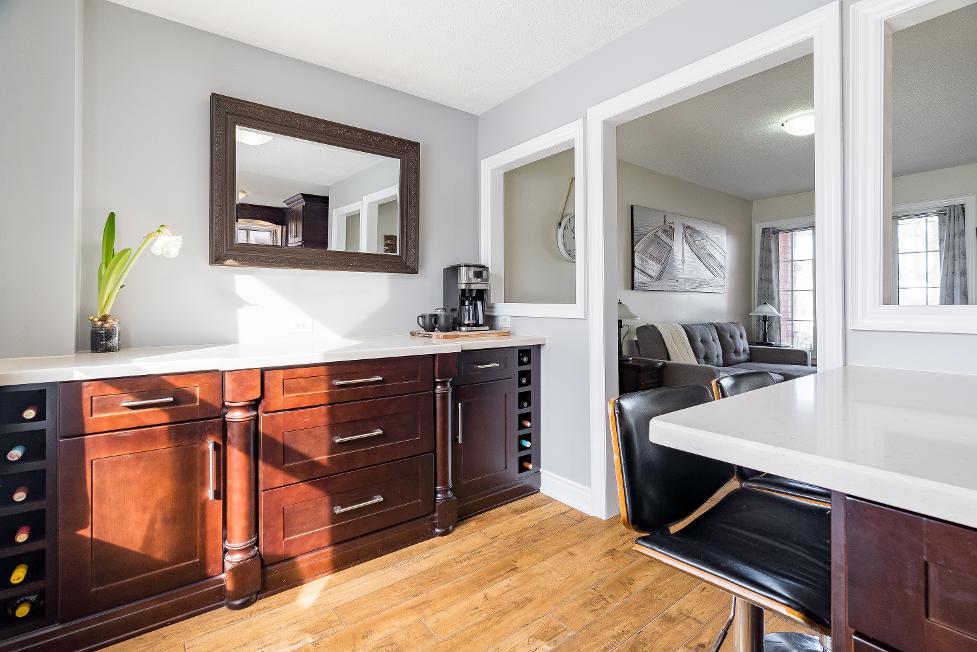 - Wealth of solid wood cabinetryfinished with radiant undermount lighting and a crown moulding detail