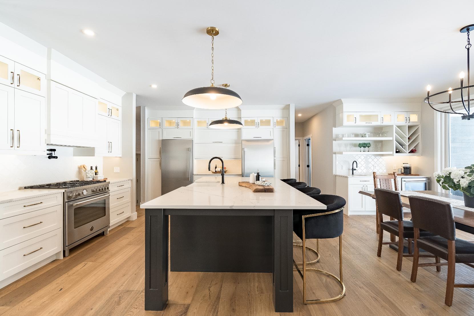 - Oversized blackcentre island with breakfast barseating,perfectlypositioned beneath two stunning light fixturesand anchored bya whitefarmhousesinkcomplete with a sleek
