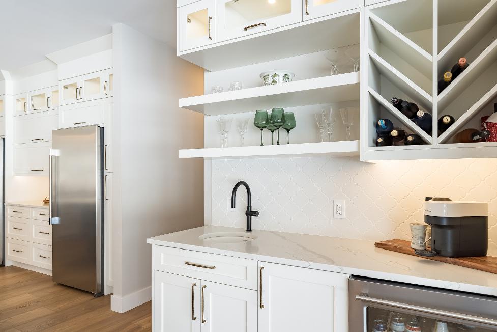 - Tiled backsplash enhanced byunder-cabinet lighting,beautifullyilluminating the prep space while adding depth and a polished finishing touch