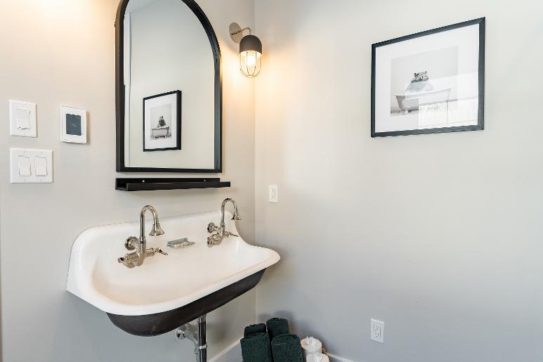 - Two statement sconces thoughtfullyplaced to framea mirror