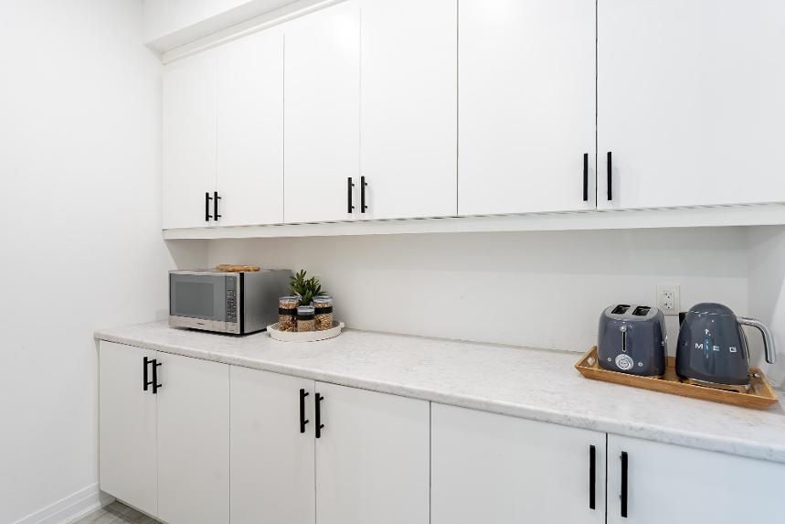 The kitchen isbuilt with a sleekcabinetry,quartzcountertops,a generousisland,a coffee barnook,and a fullwalk-in pantrythat keepseverything organized and out of sight when it mattersmost