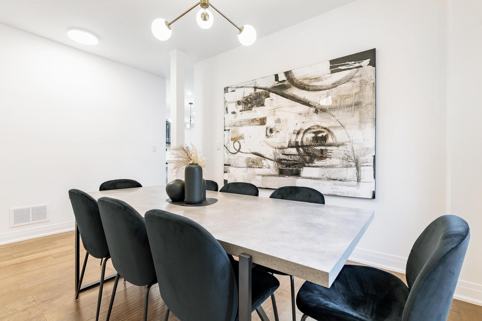 - Modern light fixture perfectlyplaced to highlight a largedining table