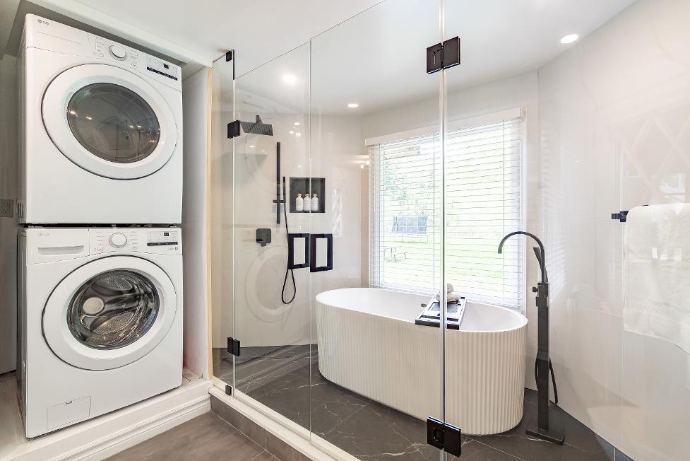 - Spaciouswalk-in showerpaired with a rainfallshowerhead,handheld shower head,and built-in niche