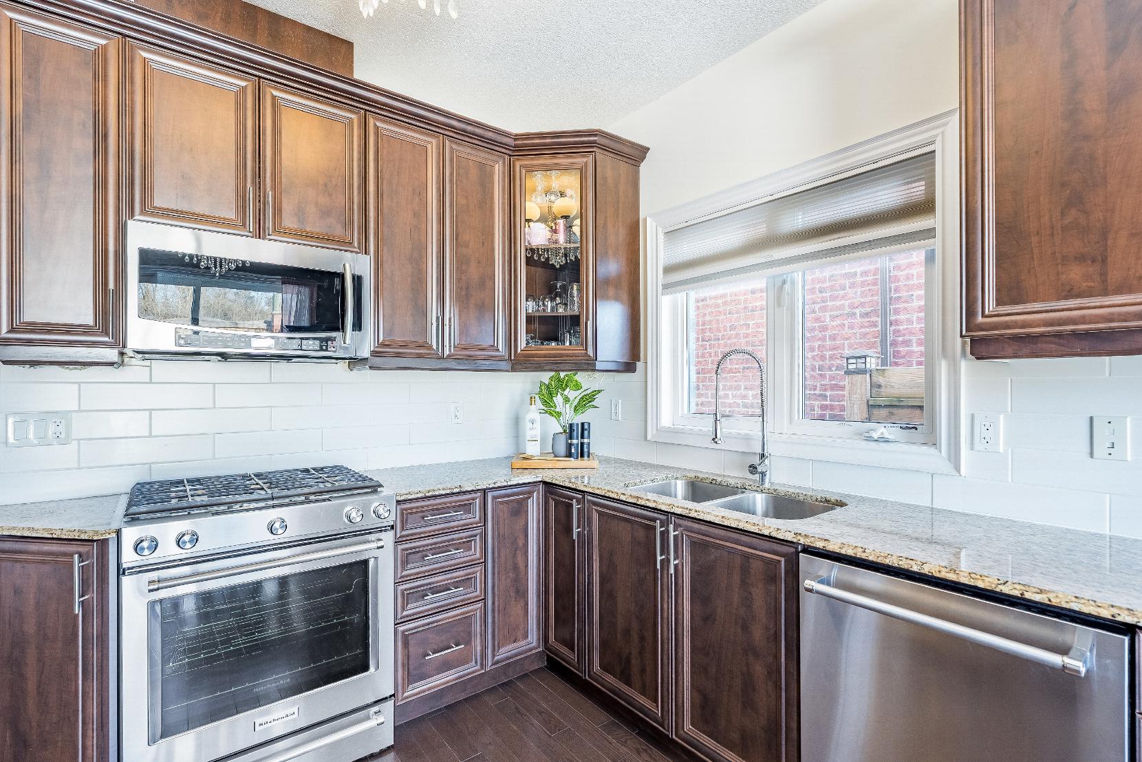 - Wealth of deep-toned cabinetryincluding a glass-fronted accent and tallcabinetsfor pantrystorage