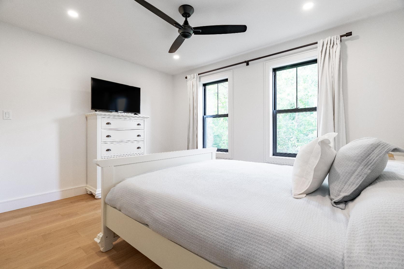 - Vaulted ceiling enhanced byrecessed lighting and a ceiling fan