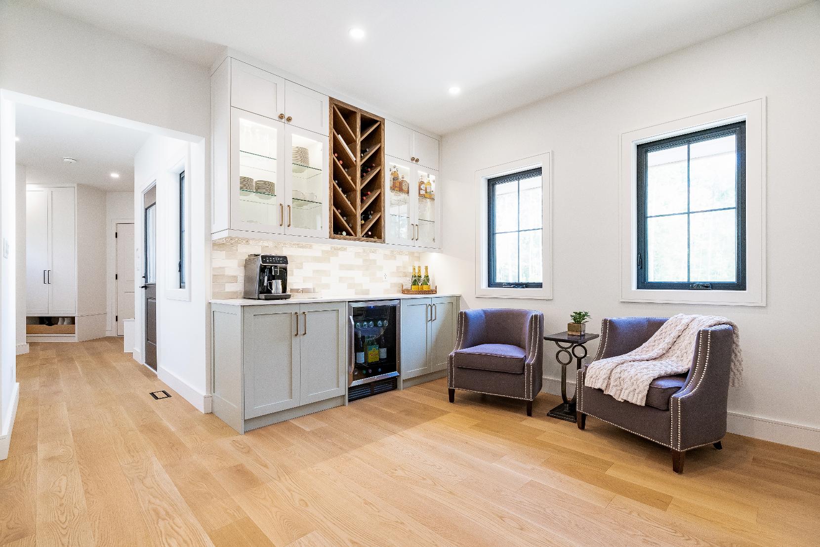 - Coffeebarcomplete with sleek under-cabinet lighting,a built-in winerack, and a beveragefridge