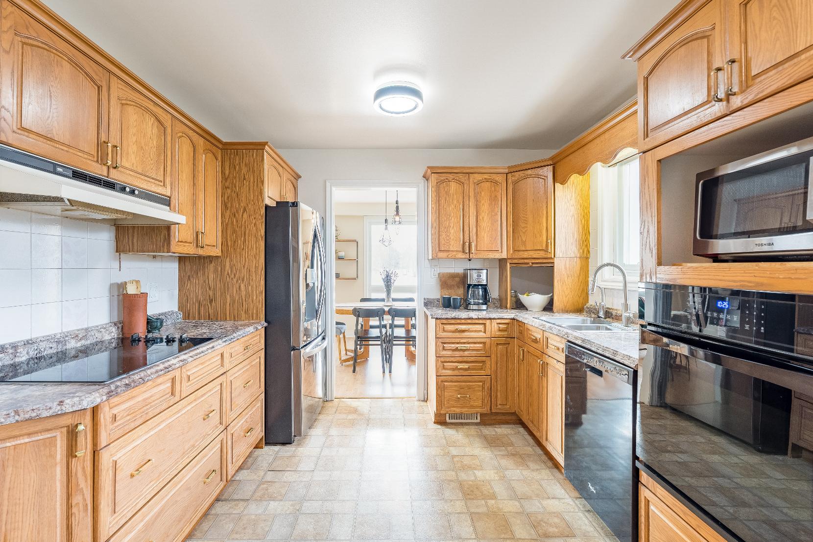 - Wealth of warm-toned cabinetryaccented bya crown moulding detail