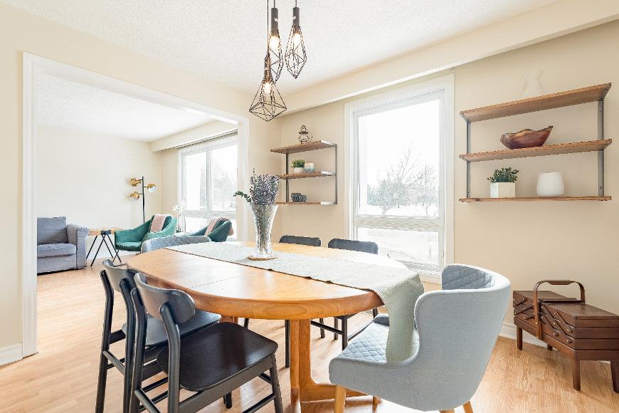 - Expansivelayout providing enough room for a seating area and a dining table