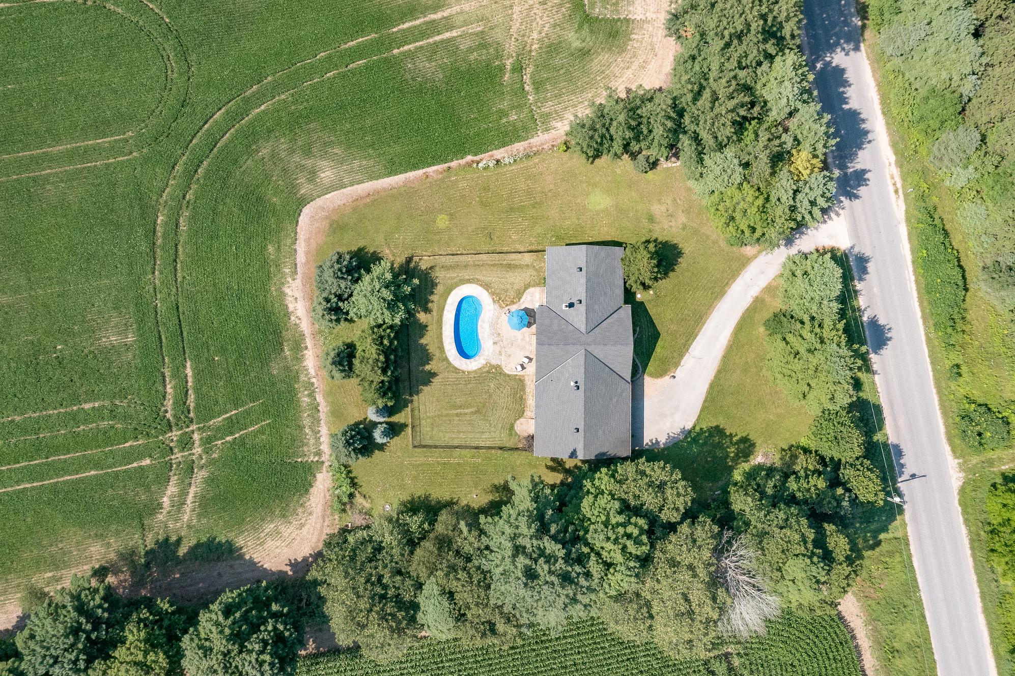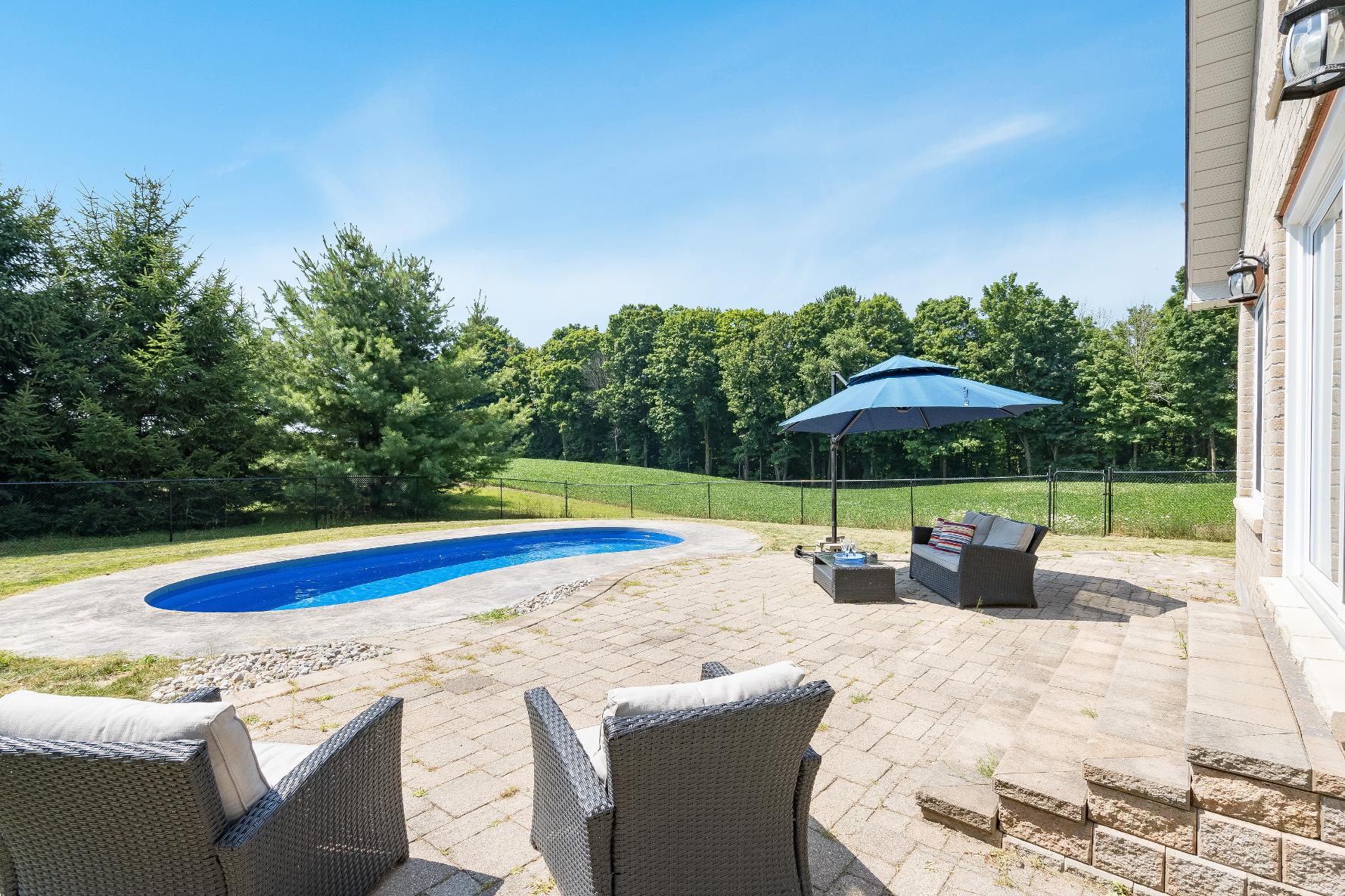 Enjoythe outdoorson nearly1 acre of land,surrounded byfieldsand forestsforadded privacy, alongsidea largebackpatio and inground saltwaterpoolproviding the perfect retreat