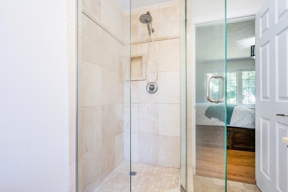 - Glass-walled shower equipped with a built-in nicheand a handheld showerhead