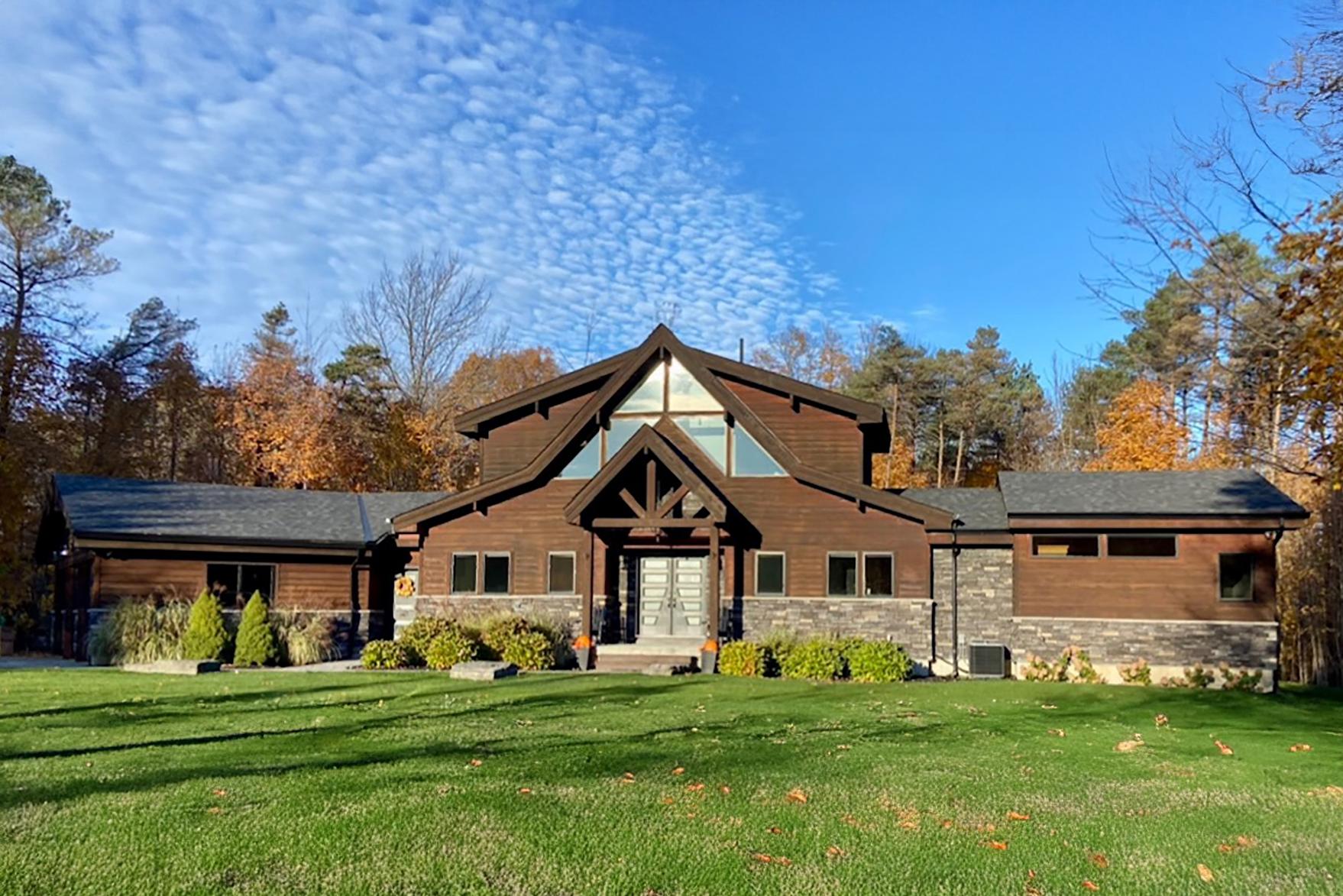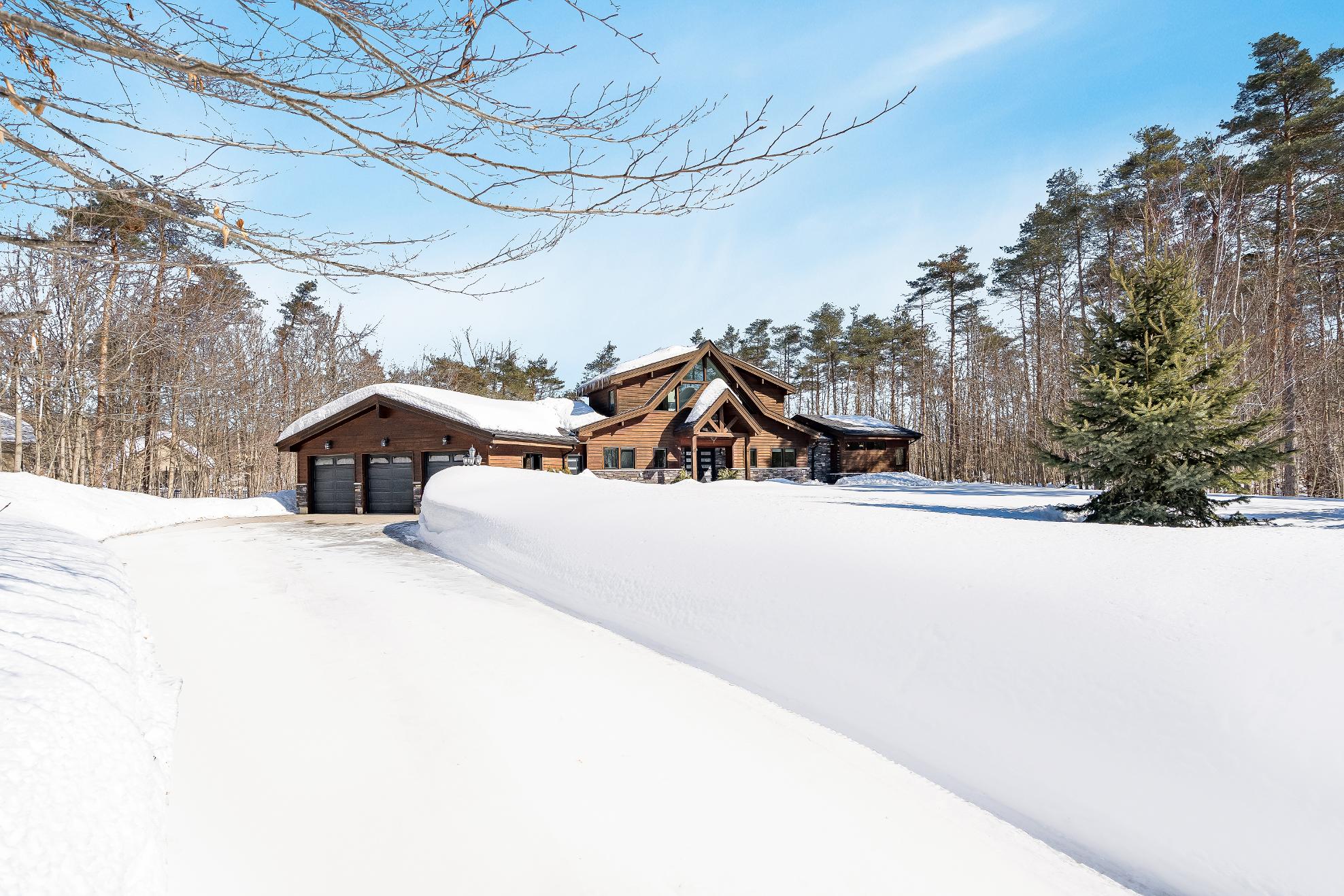 From the moment youturn onto the street,thisextraordinaryestate commandsattention,set on overan acrein a prestigiousneighbourhood framed bymature trees,lush irrigated lawns,and striking rocklandscaping,with stamped concrete walkwaysand patios,an oversized triplegarage, and stunning evening lighting that makesa lasting impression dayand night,allwhile sitting just 11 minutesto Orillia and 18 minutesto Barrie