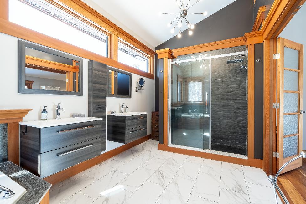 Theprimarysuite isa world unto itself,where a vaulted ceiling and privatewalkout accessto a stamped concretepatio and hot tub set the tonefor totalrelaxation,and the spa inspired ensuite deliverson everylevelwith heated tilefloors,dualfloating vanities,a deep soakertub,and a walk-in showerfeaturing rainfallshowerhead and bodyjets,allframed byserene and peacefulviewsof naturejust beyond the glass