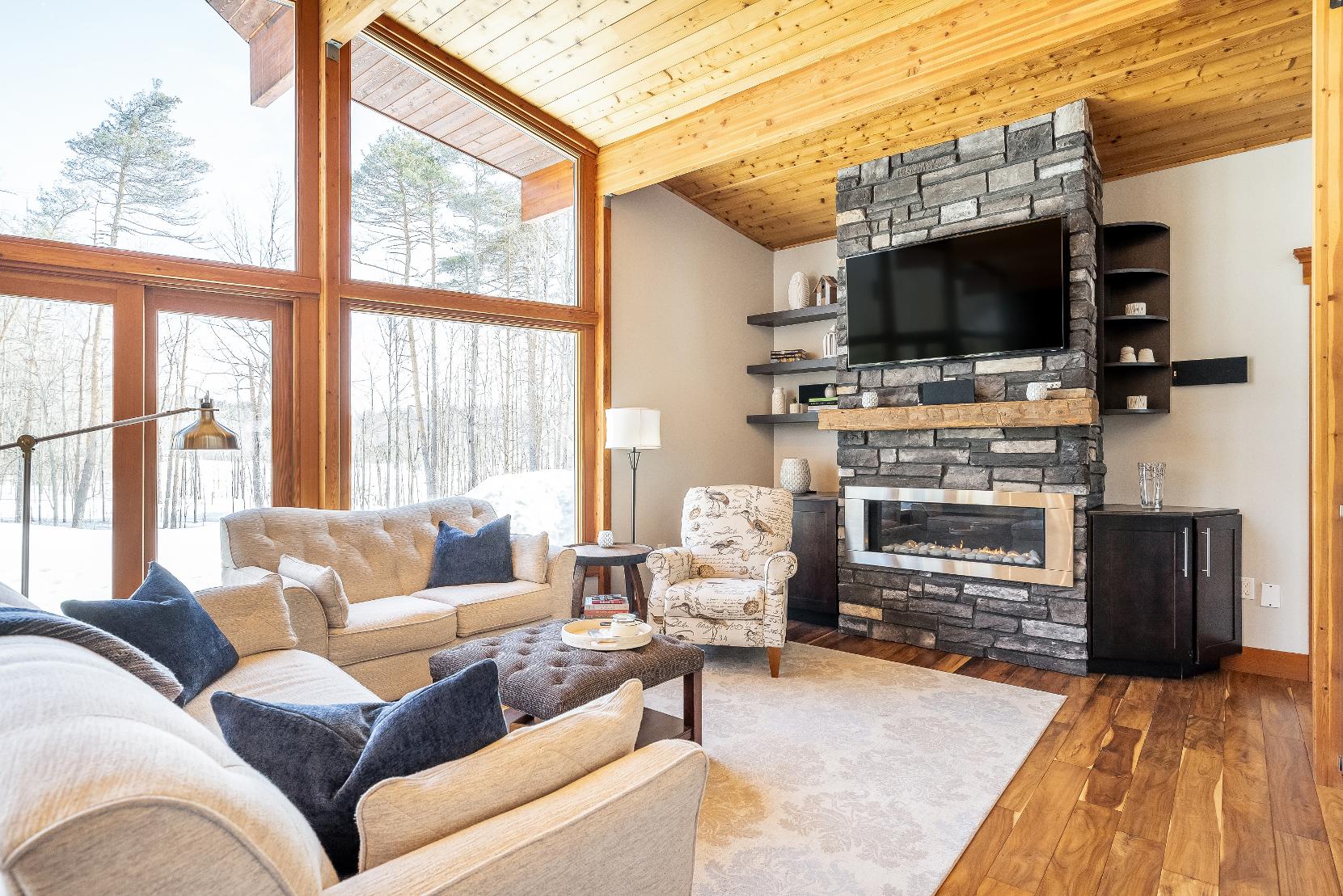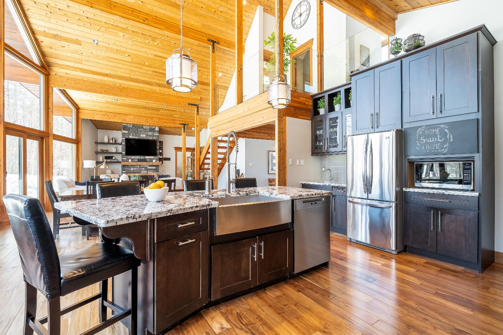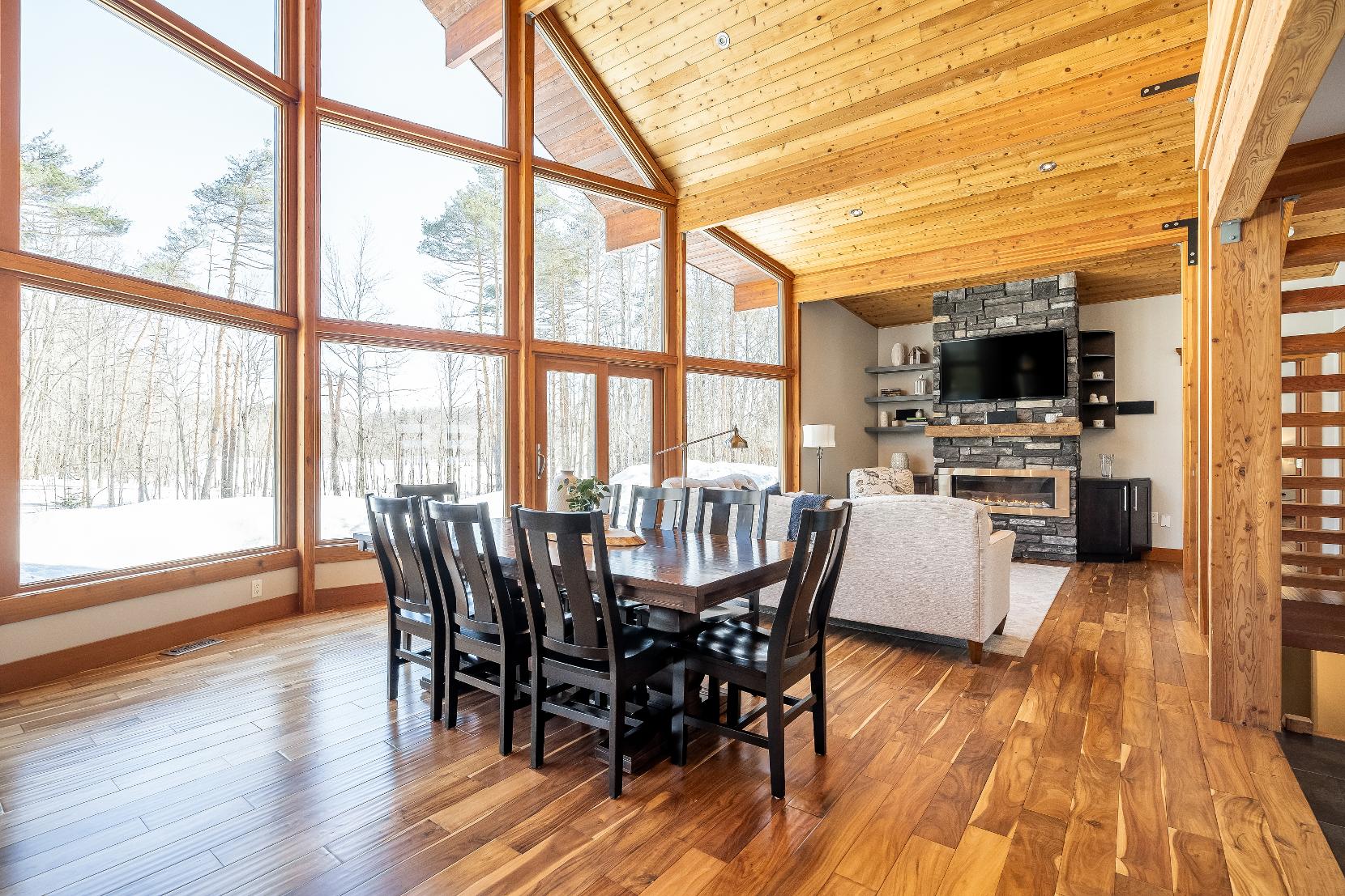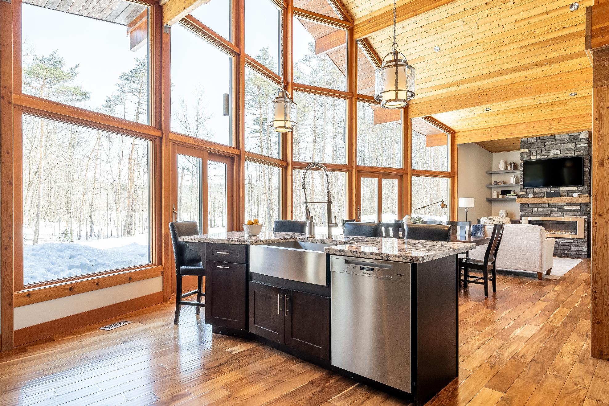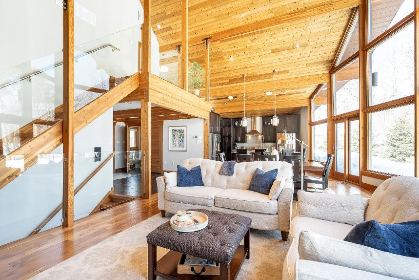 Stepping inside,you're greeted bysoaring 23?vaulted ceilings,expansivewindows,and a breathtaking open-concept design that floodsthehome with naturallight and sweeping viewsof nature,whereexposed beams,a dramatic stonefireplace with a reclaimed mantle from the originalHouben farmstead,tempered glassrailings,and solid core Douglasfirdoorscome togetherto create a space that isaswarm and storied asit is architecturallystunning