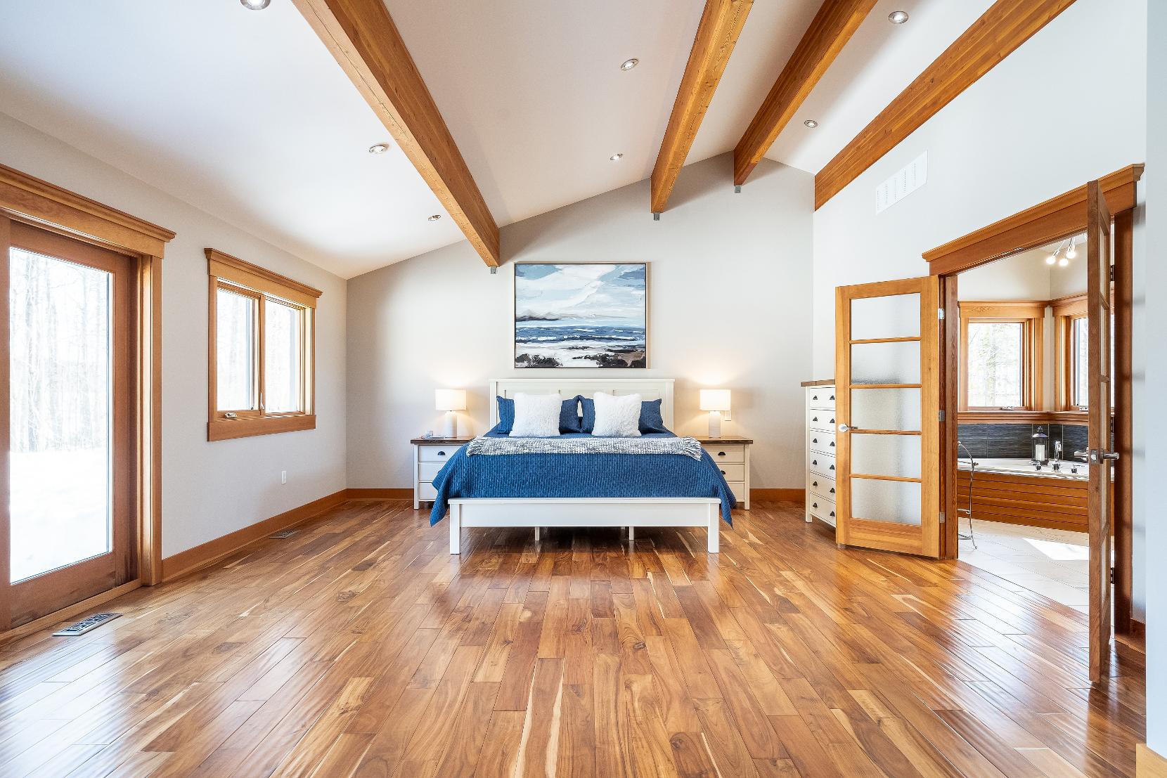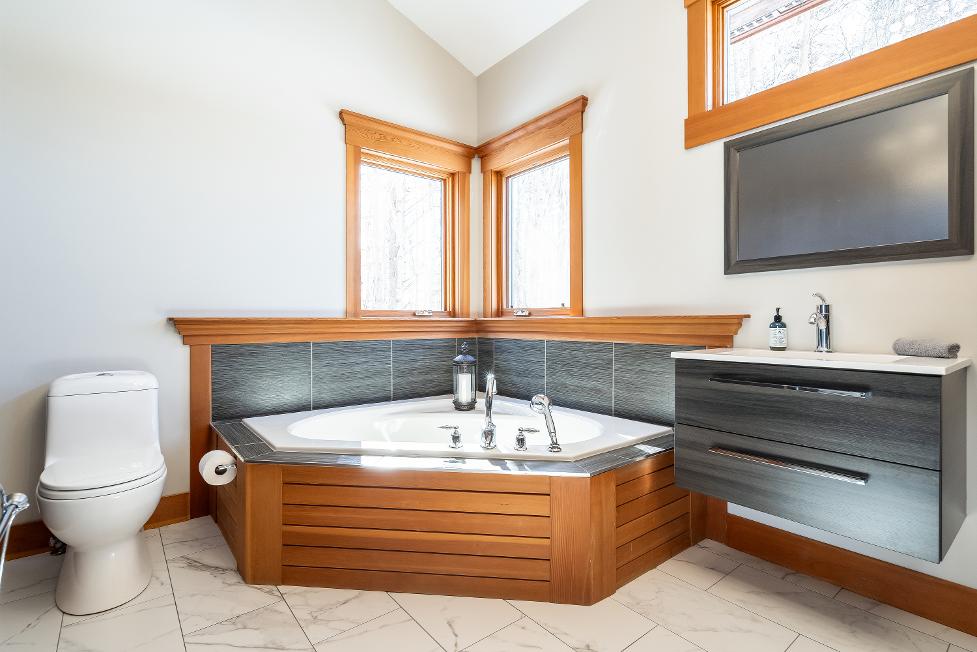 - Largesoakertub perfectlypositioned between two windows,capturing serene views of the surrounding nature