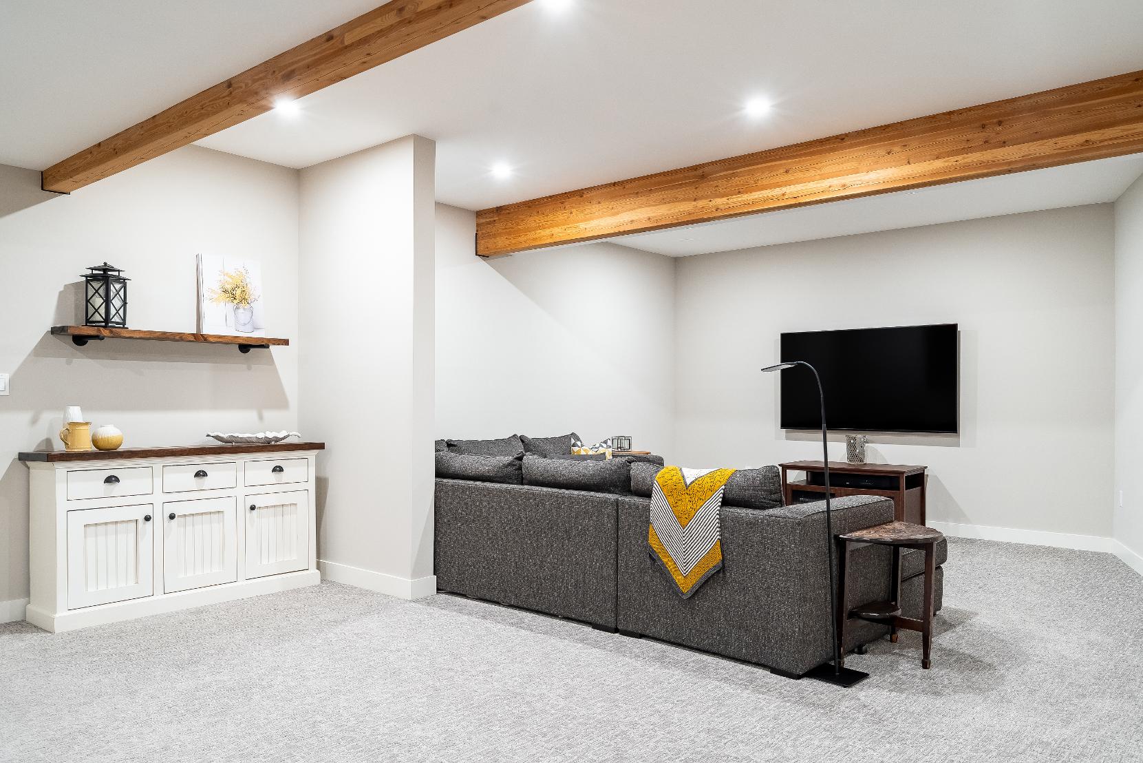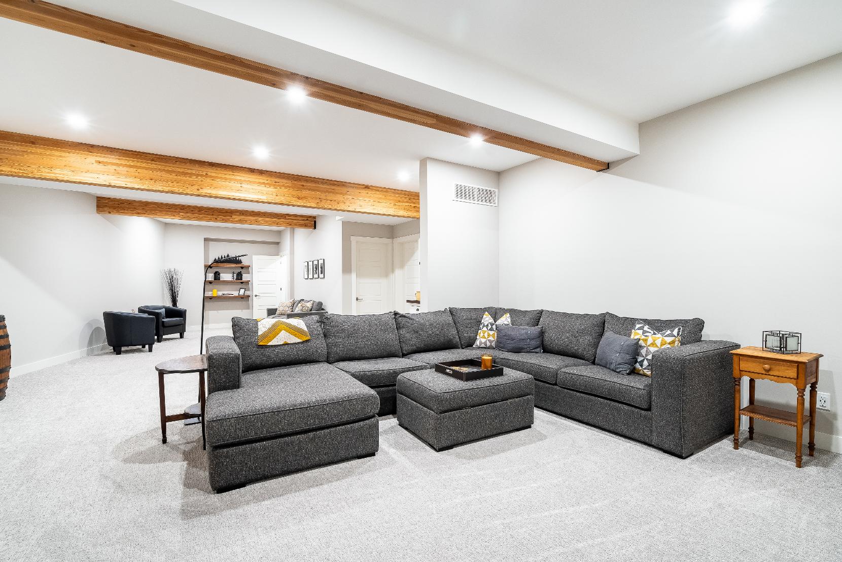 - Vaulted ceiling complemented by architecturalwood beam accentsand recessed lighting
