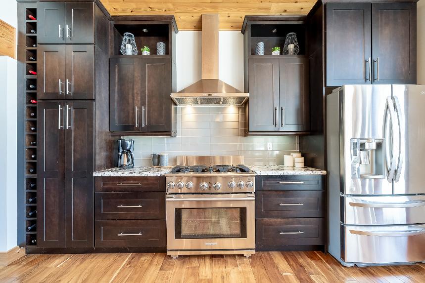 - Talland grand rich-toned cabinetryfinished with undermount lighting,a built-in winerack, and timelesscrown moulding details