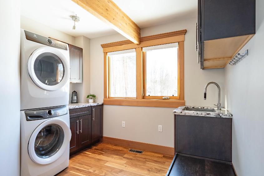 - Laundrysinkset below dark-toned cabinetry