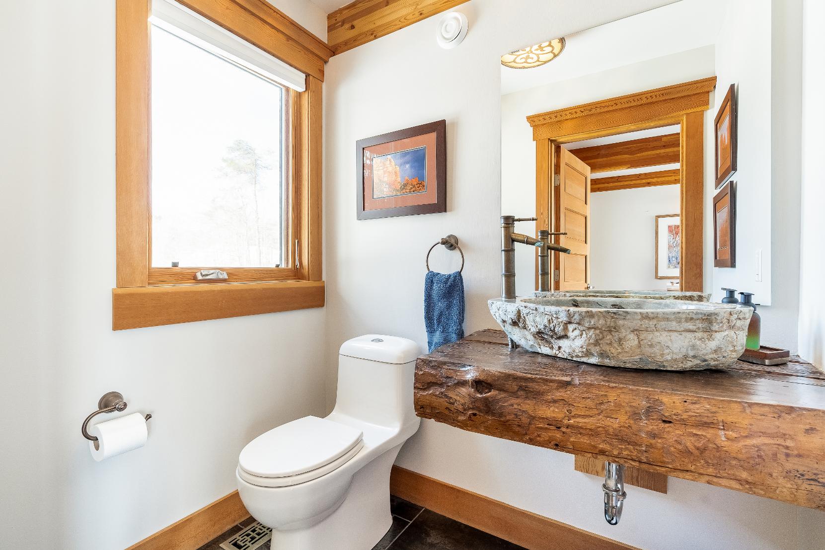 - Custom wood slab vanityflaunting a natural stonevesselsink