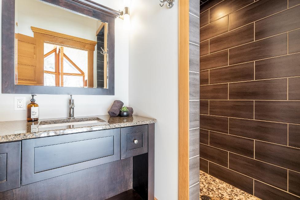 - Wood vanityequipped with a sleekcountertop
