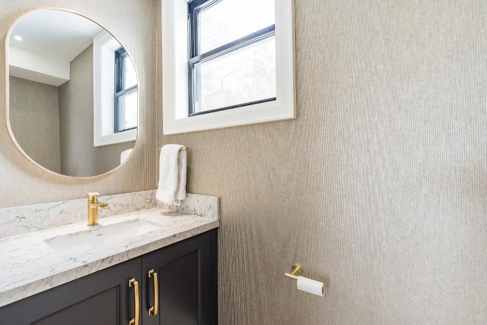 - Bluehoned quartz-topped vanity complemented bya brass-coloured faucet