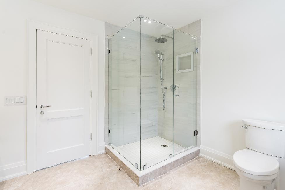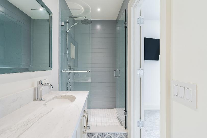 - Walk-in showerfinished with a rainfallshower head,a handheld showerhead,and a sleek tiled surround