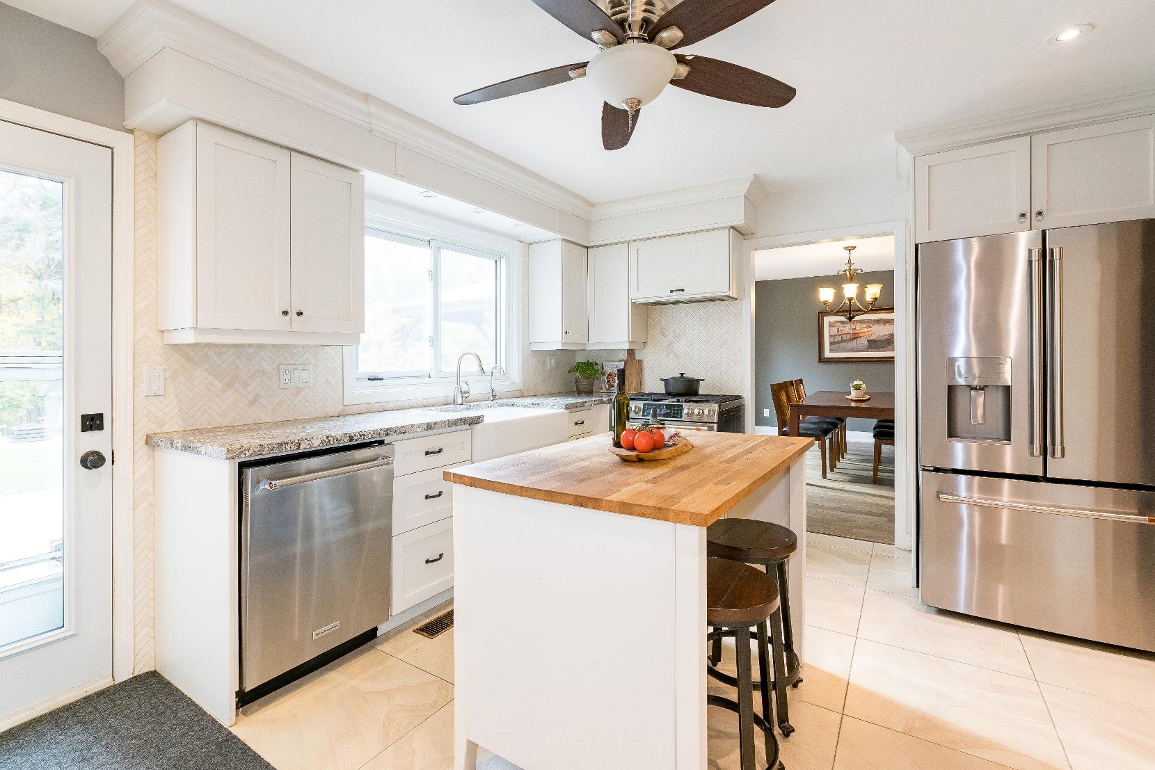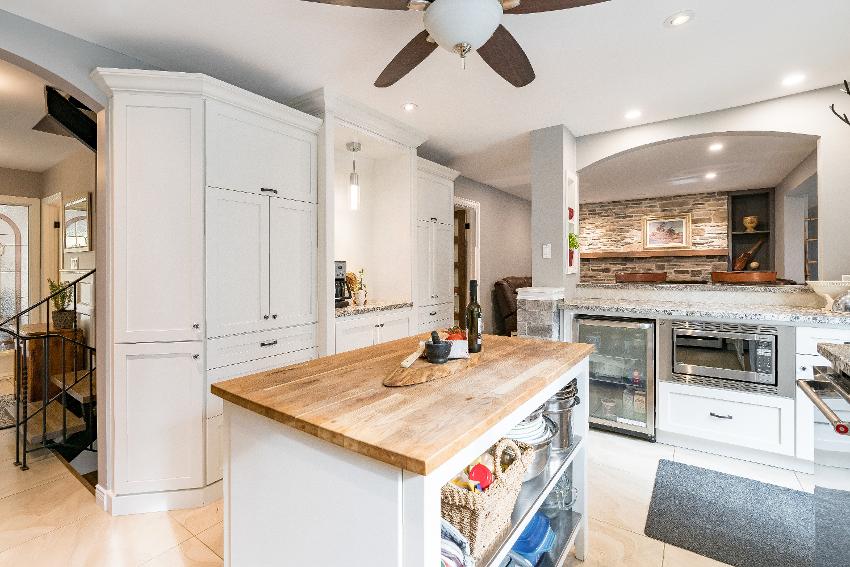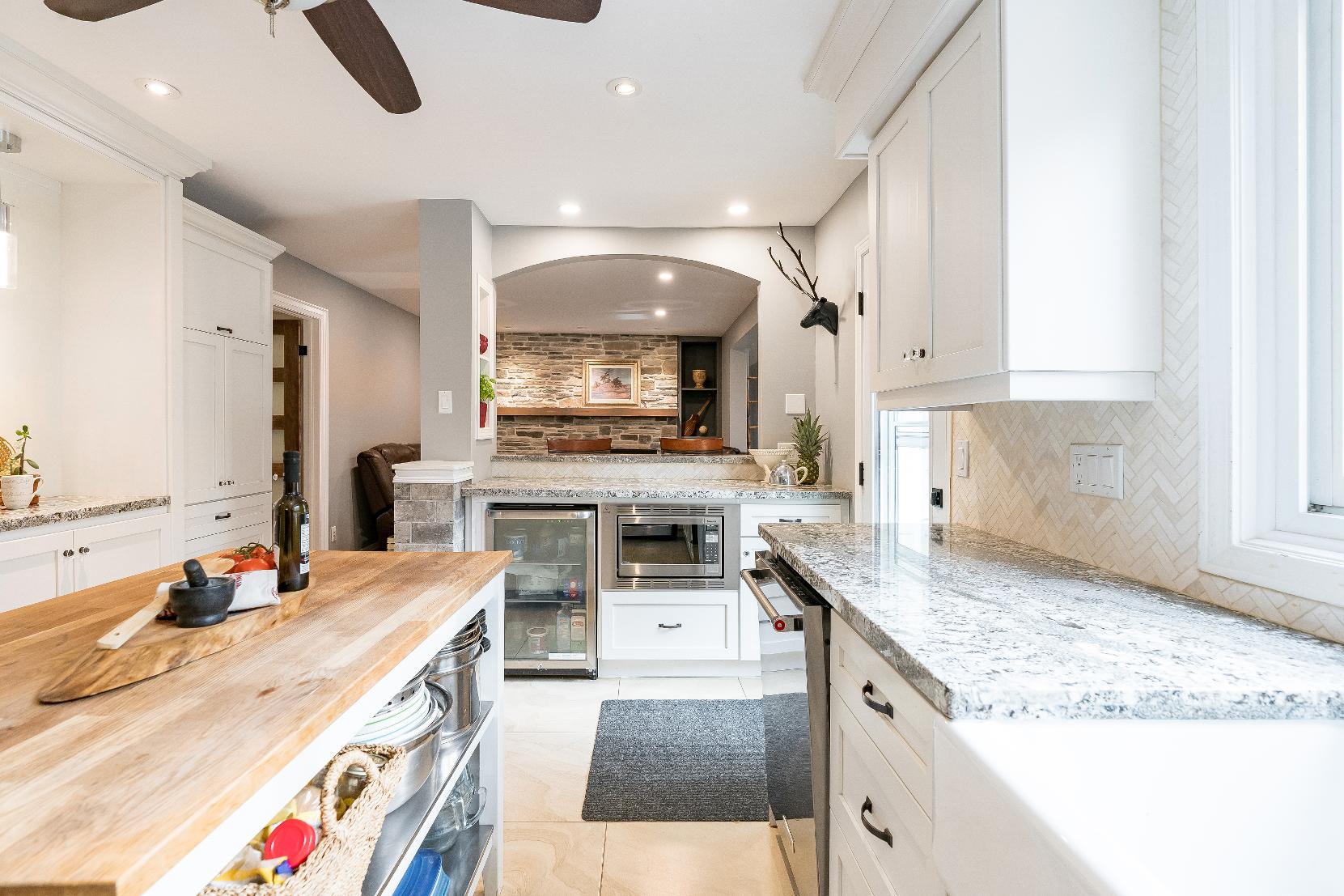 - Centreisland complemented bya butcher blockcountertop and breakfast barseating