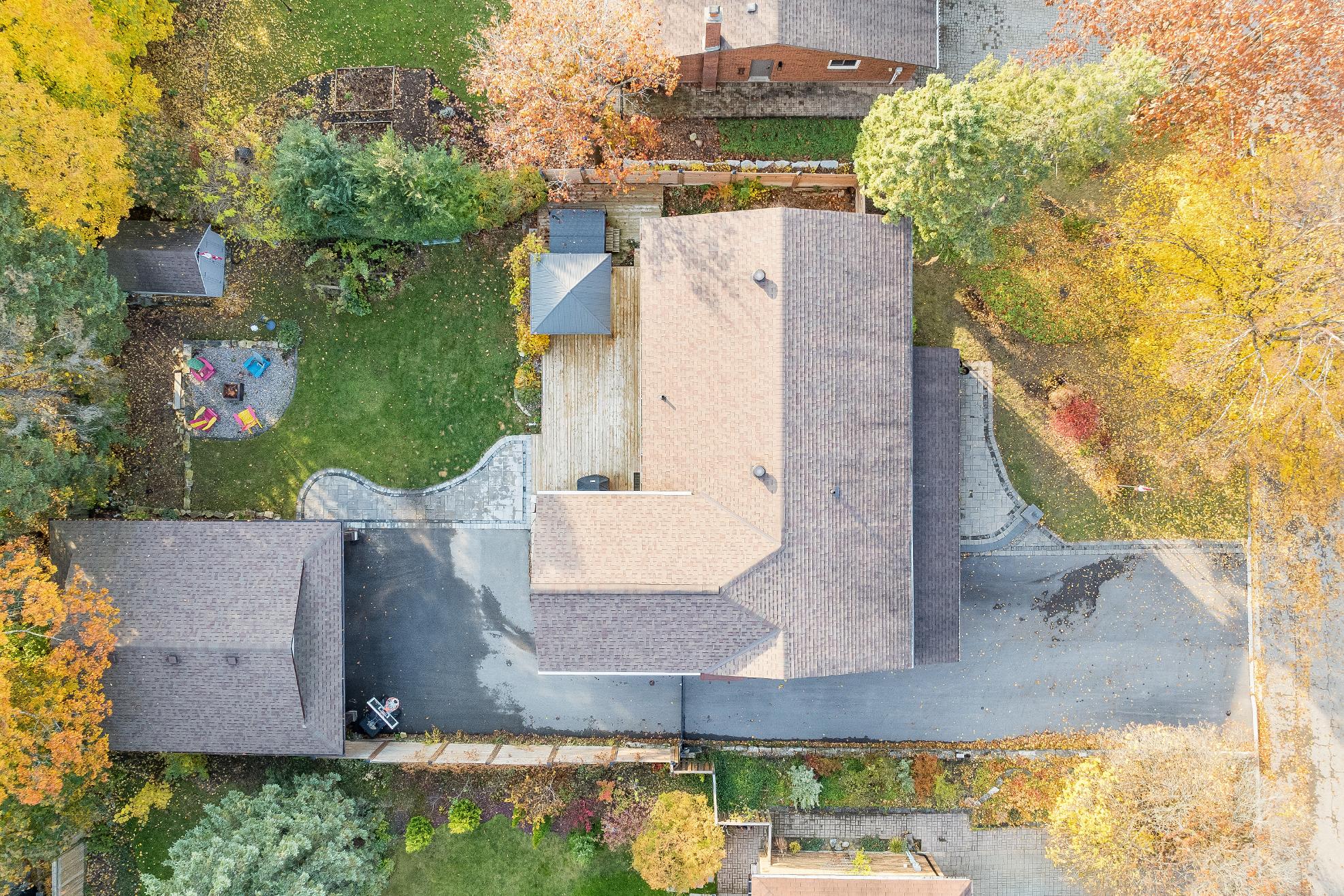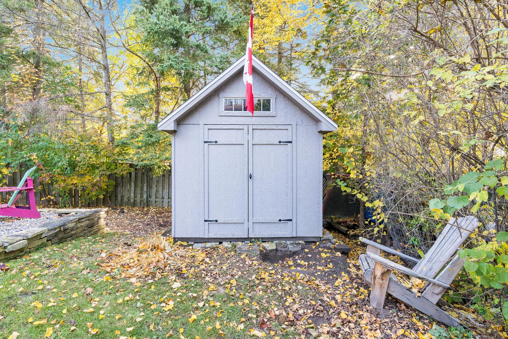 - Backyard retreat surrounded by maturetreesforadded privacyand flaunting a sizeable deck,cozy firepit,and a garden shed