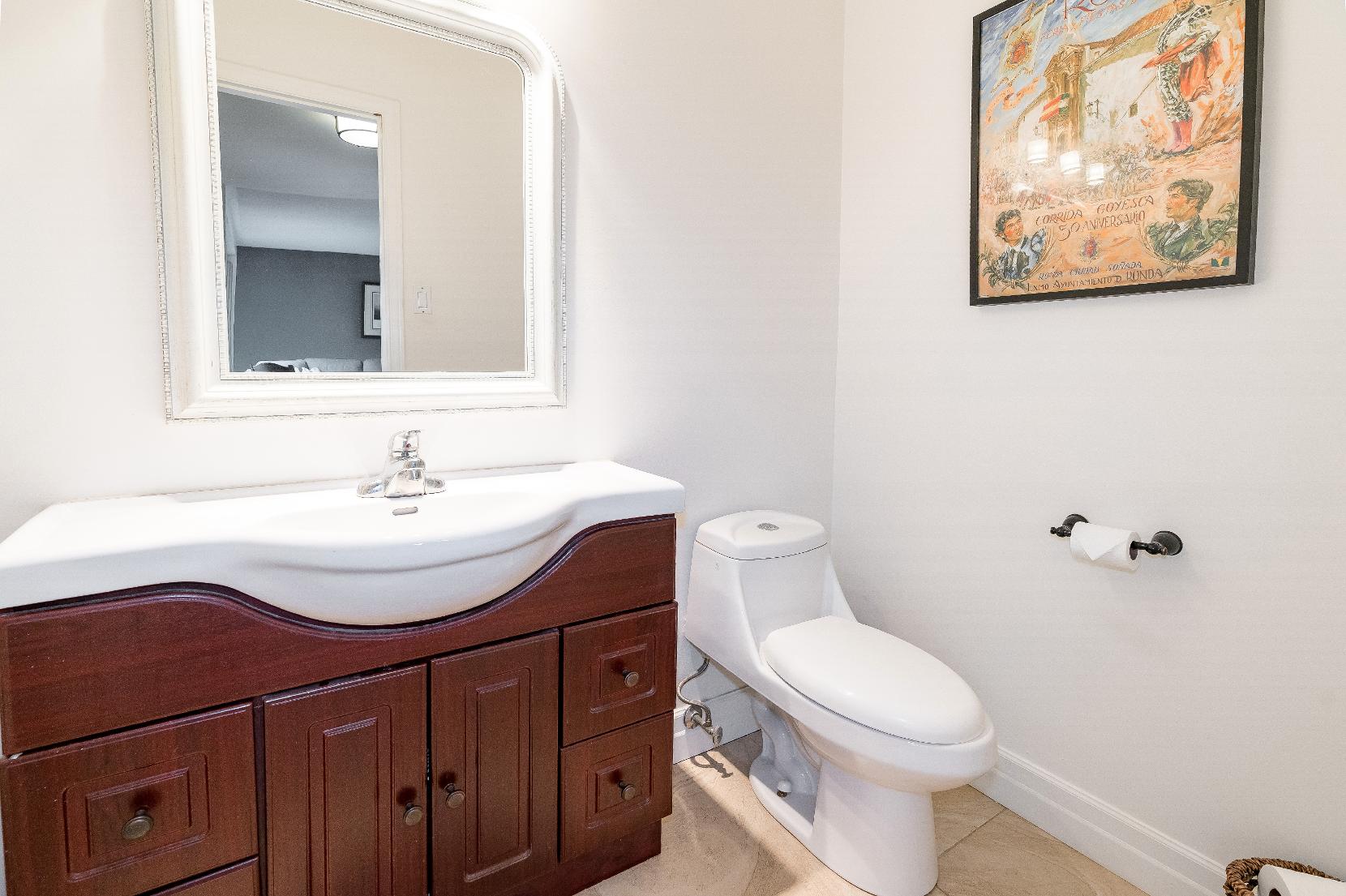 - Chic vanitywith rich-toned cabinetry