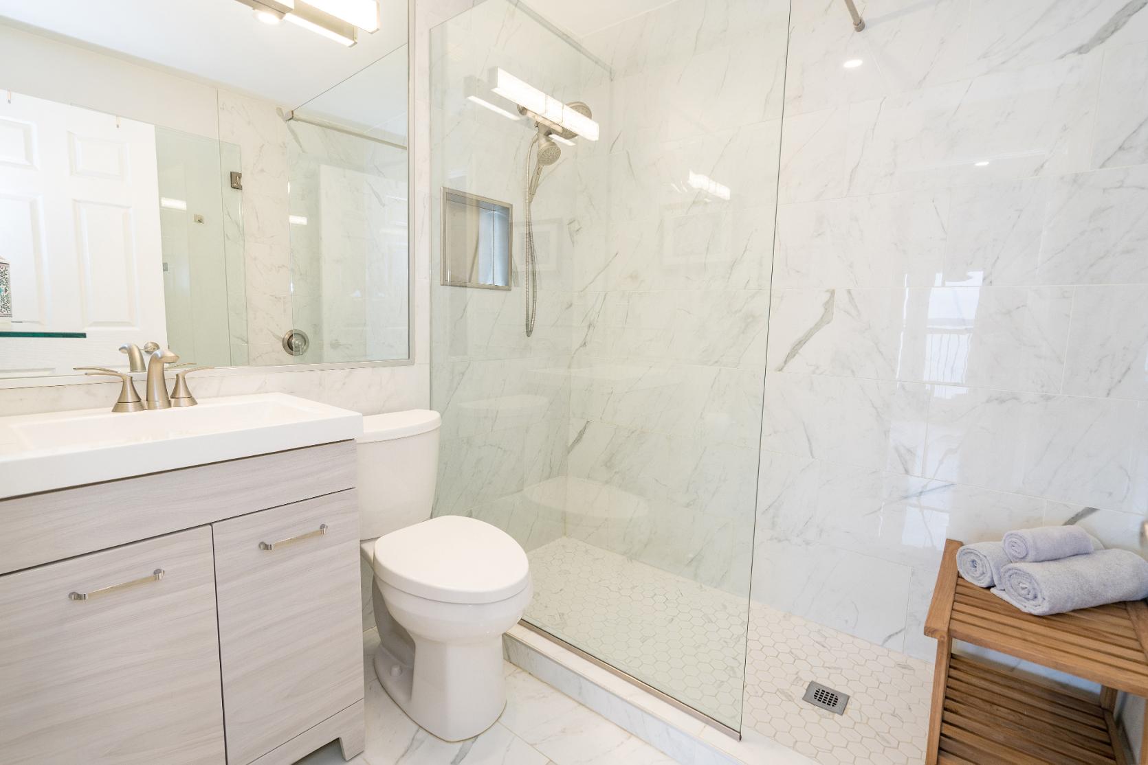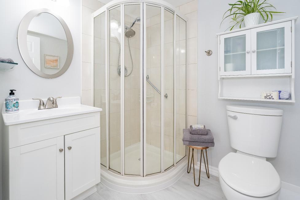 - Glass-walled showercomplete with a handheld showerhead and a built-in niche