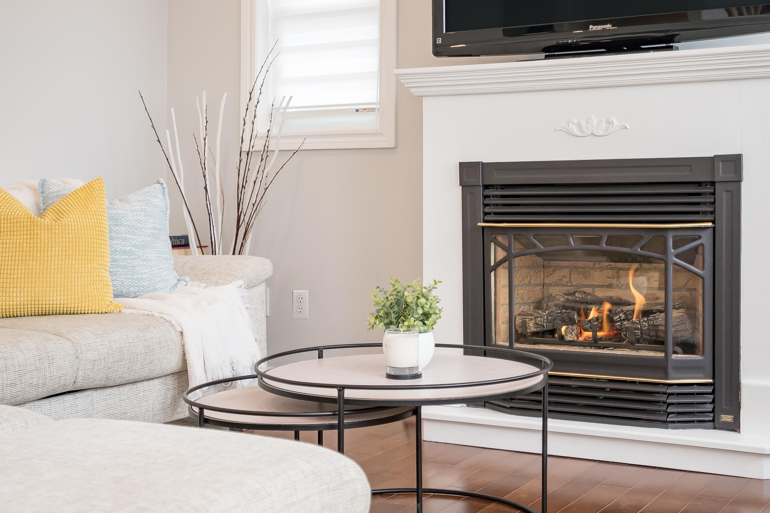 - Gasfireplacewith a shiplap feature wallgracing the space with additionalwarmth