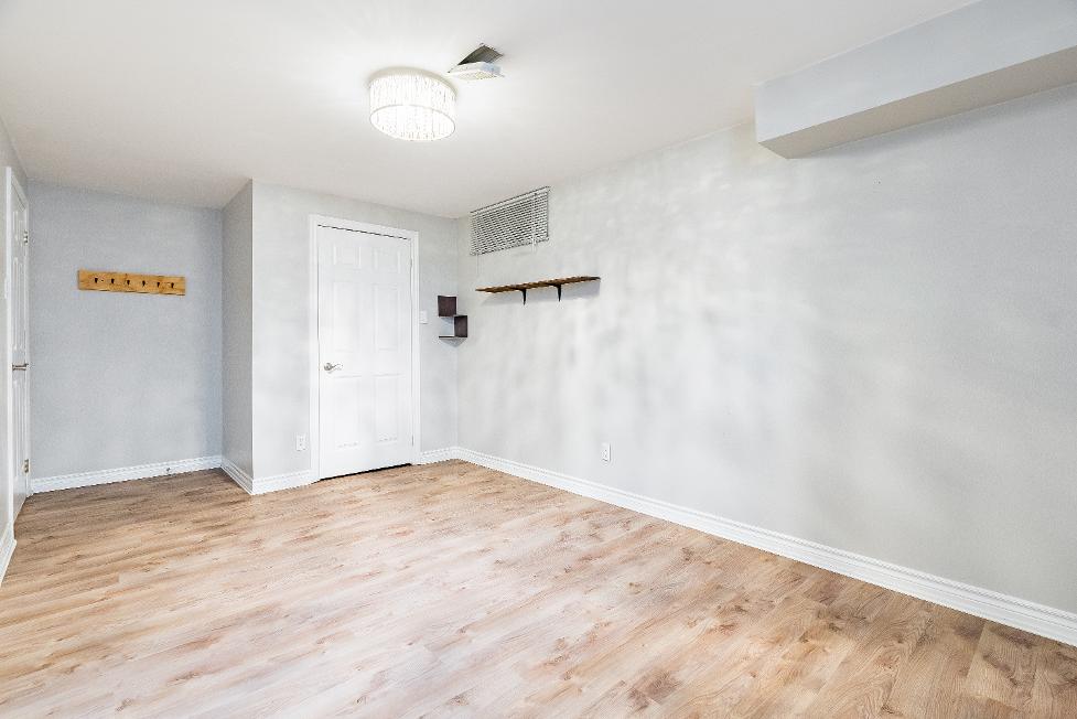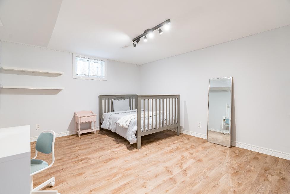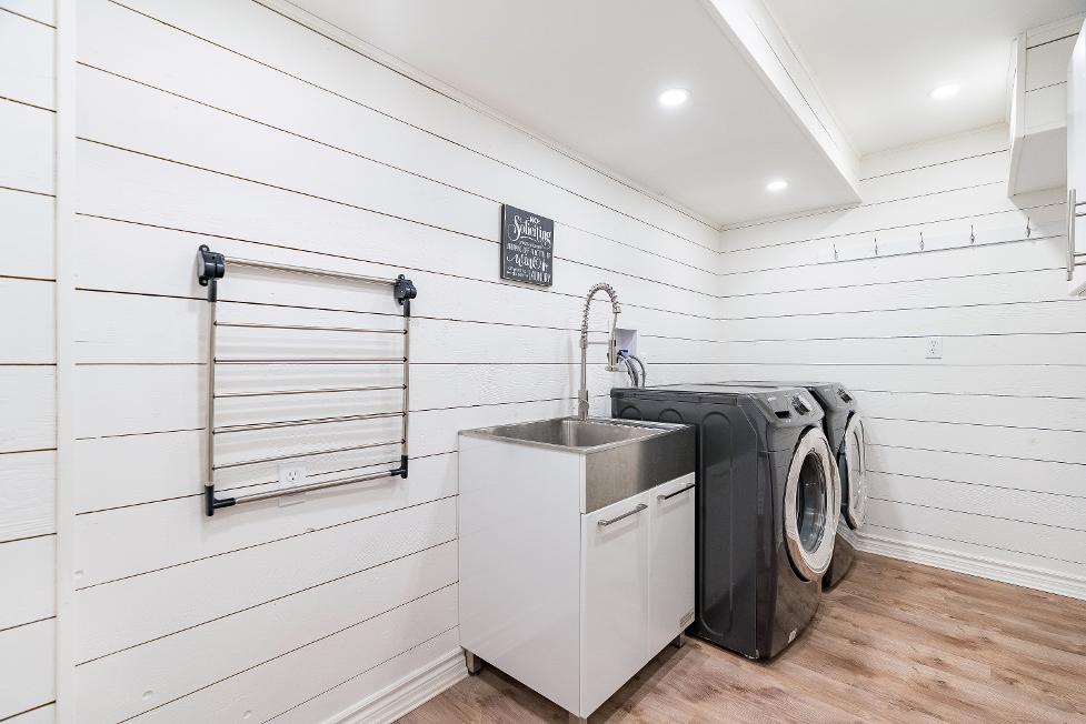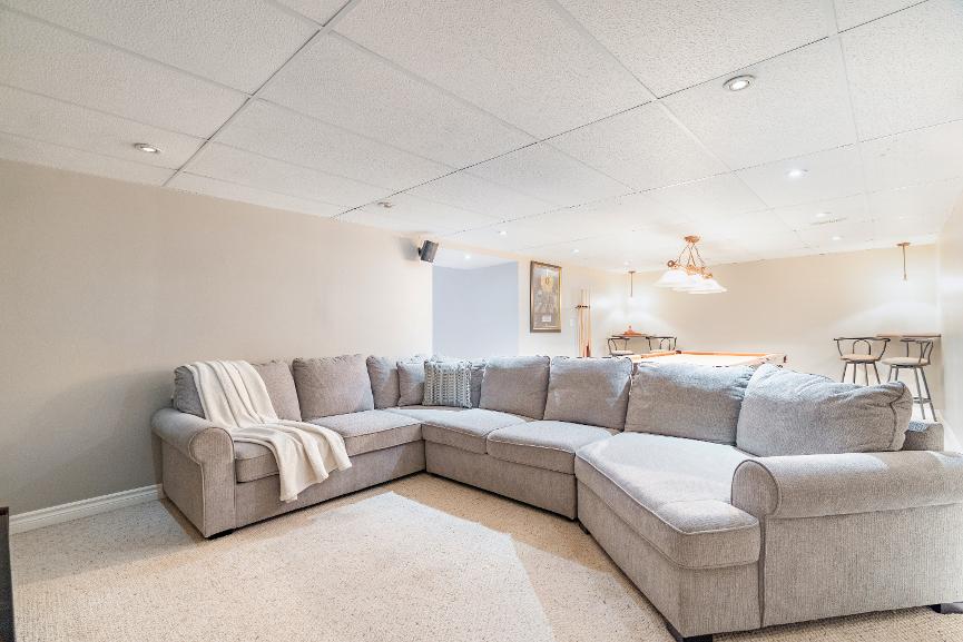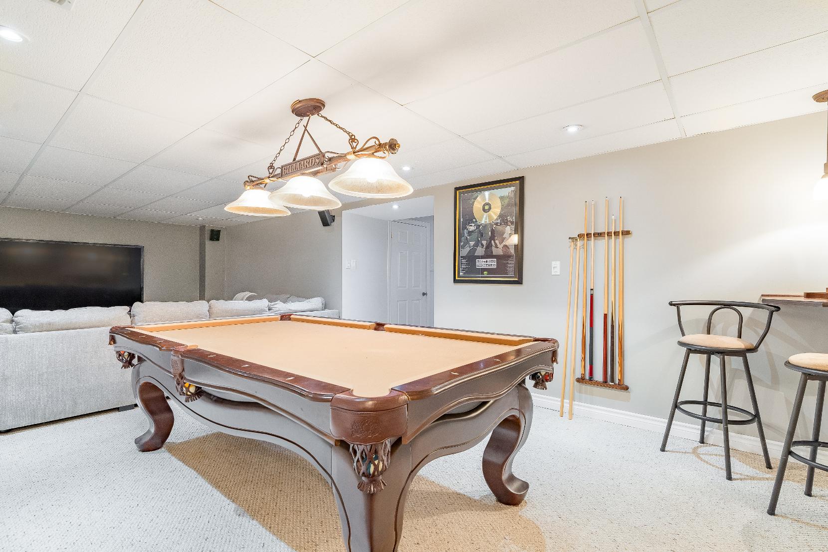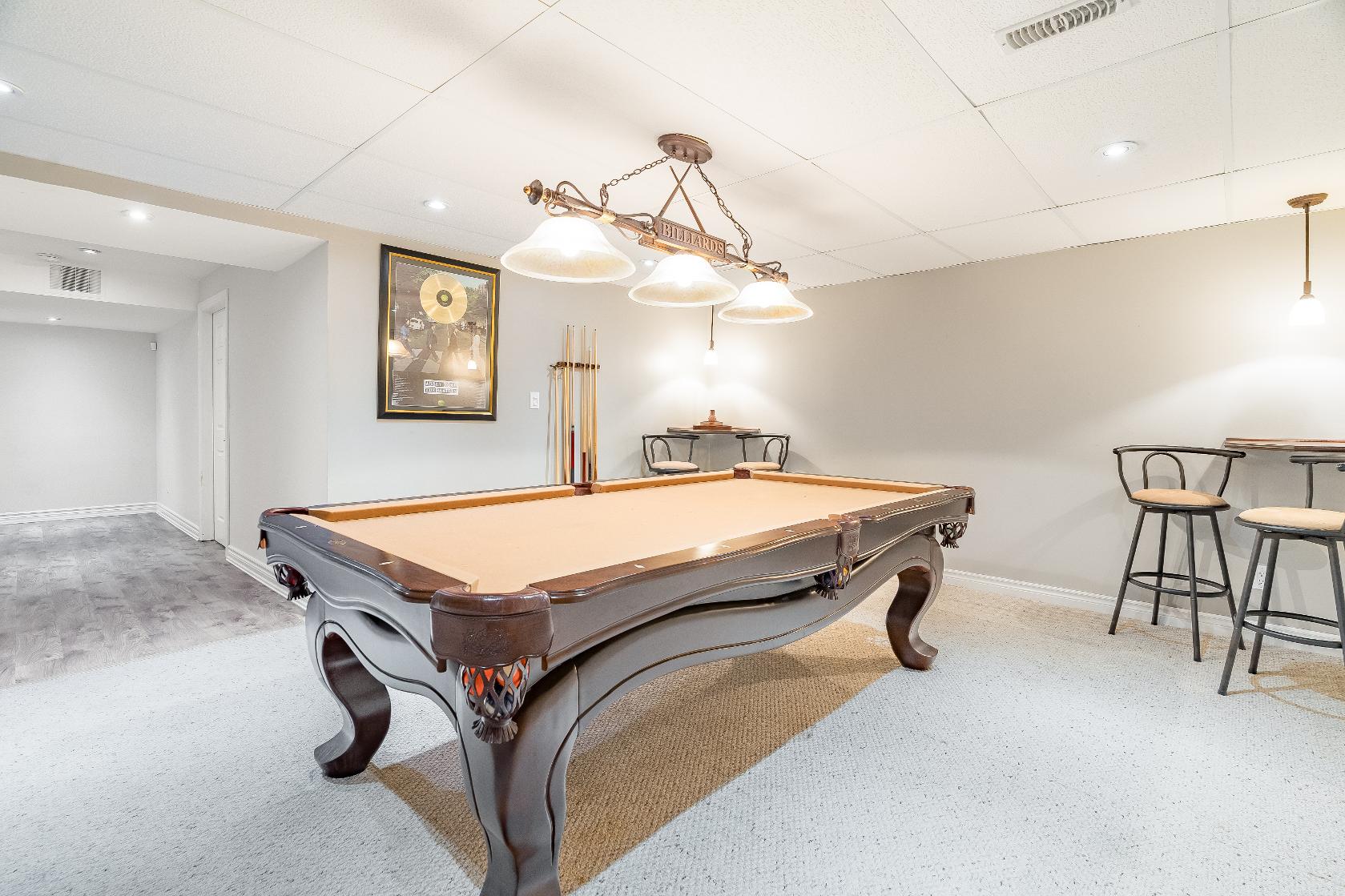 Fullyfinished basement hosting two largebedroomsand a spaciousfamilywith an included pooltableand television with surround sound,along with a finished laundryroom