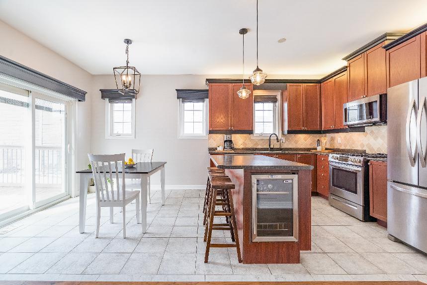 Main levelfeaturing engineered hardwood underfoot,tall9' ceilingsthroughout,and a large eat-in kitchen with an island and beverage fridge,a walk-in pantry,stainless-steel appliancesincluding a gasstove,and sliding glass-doorwalkout leading to the backyard