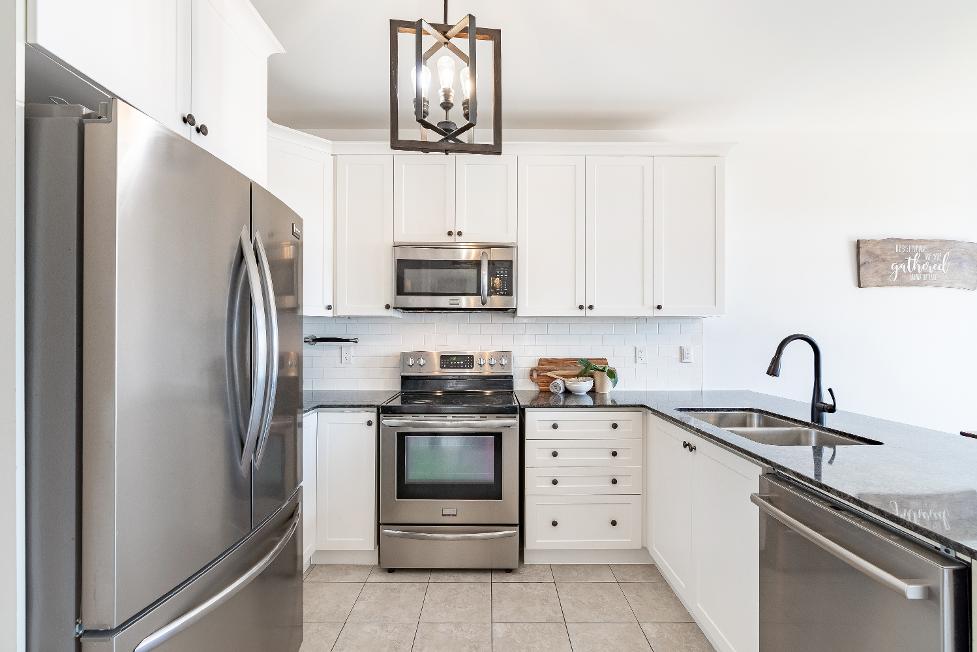 - Crisp whiteshaker-style cabinetrywith contrasting blackhardware and a crown moulding detail