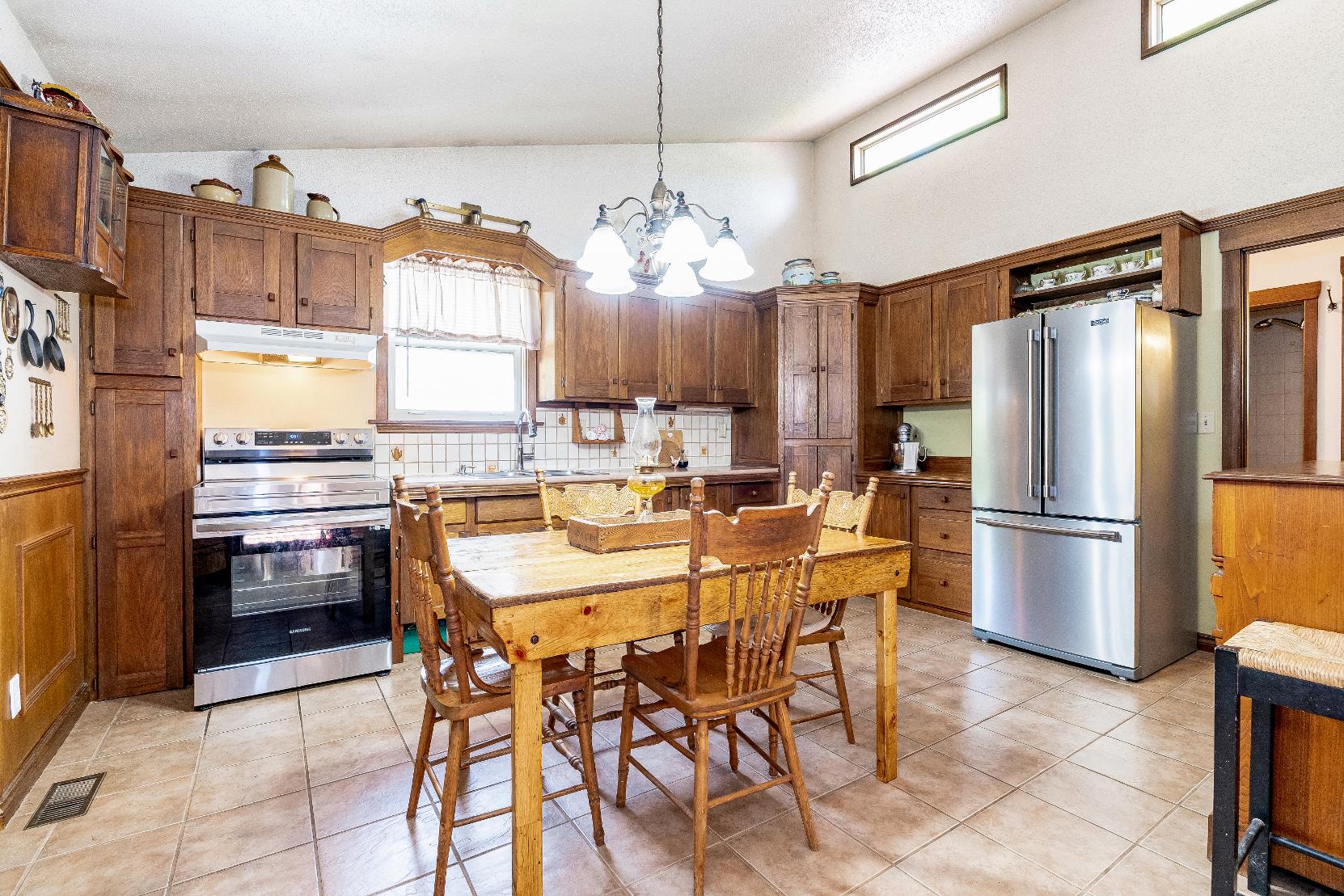 The eat-in kitchen isboth functionaland fullof character,featuring custom-built wooden cabinetry, with a bright sunroom extending from the rearof the kitchen,flaunting a peacefulspaceto enjoy morning coffee oran afternoon read whiletaking in the viewsof the surrounding nature