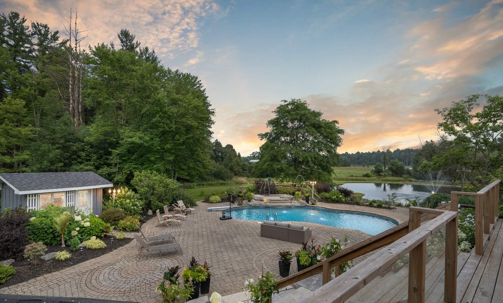 inground poolwith a tranquil waterfall,and a tikibaroverlooking the fieldsand pond,creating the idealspace forentertainment