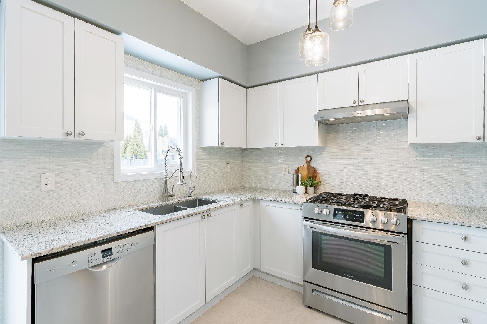 - Granite countertop accented with a stylish tiled backsplash