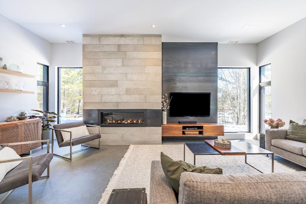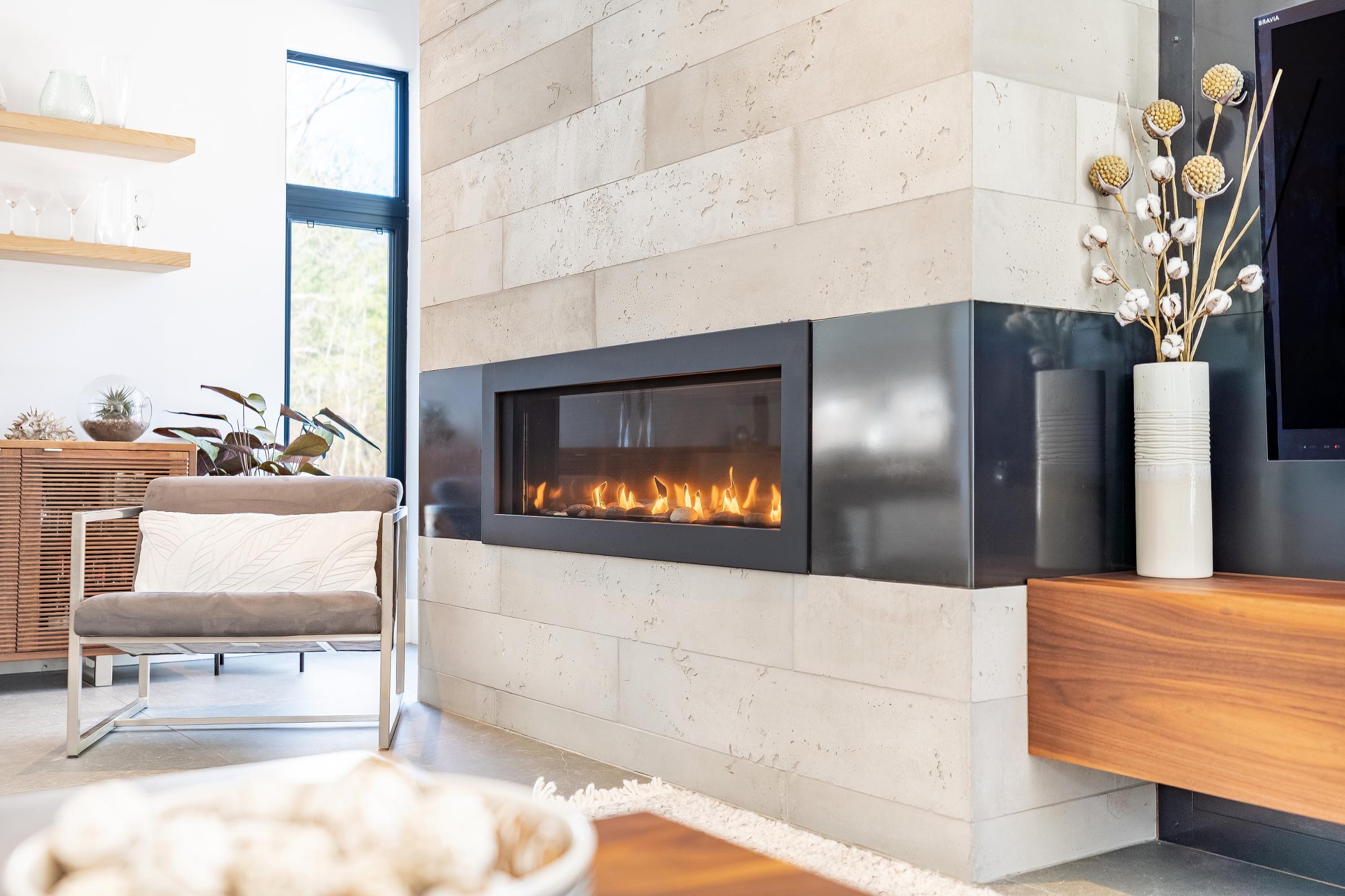- Napoleon linearfireplace enclosed within a uniquetile and cold-rolled steel feature wall
