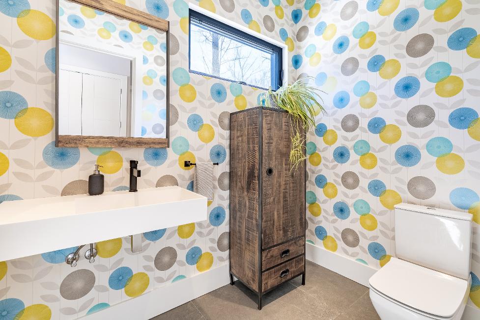 - Oversized windowpresenting viewsof the treed surround