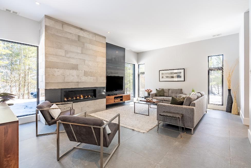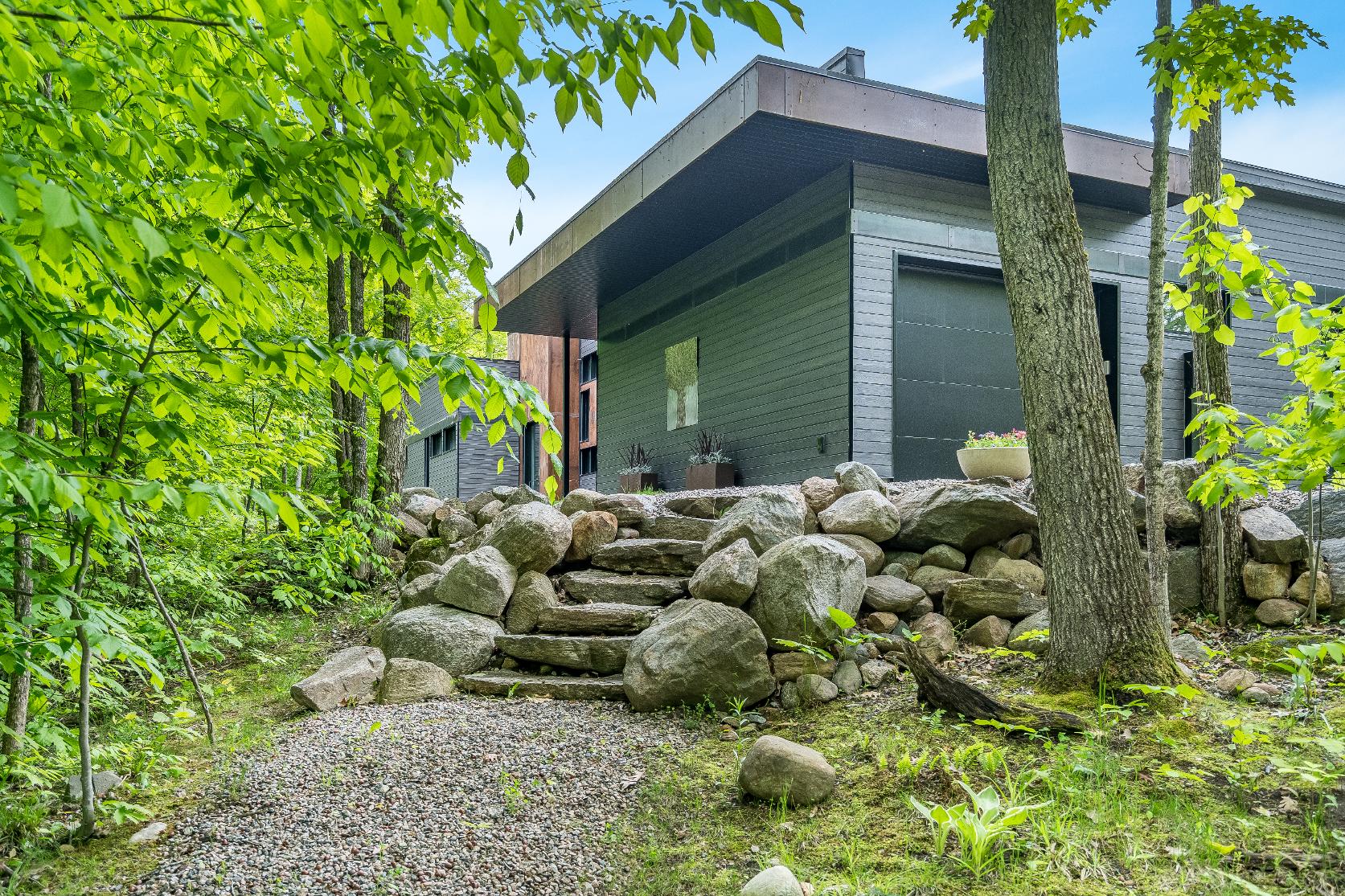 Expansive kerfed floor-to-ceiling windowsflooding the open-concept interiorwith naturallight,offering breathtaking waterviews,granite ridge outcroppings,and a wooded lot that seamlesslyintegratesthe home with itsstunning surroundings