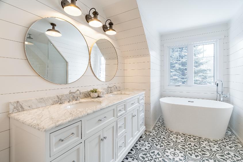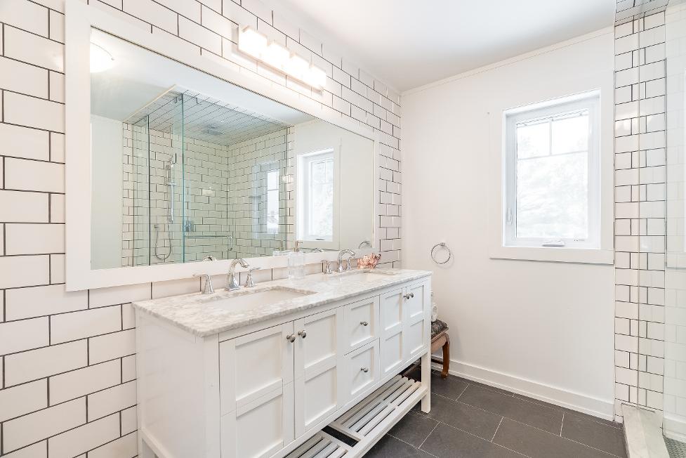 - Custom marble-topped dualsinkvanitywith classic shaker-stylecabinetry