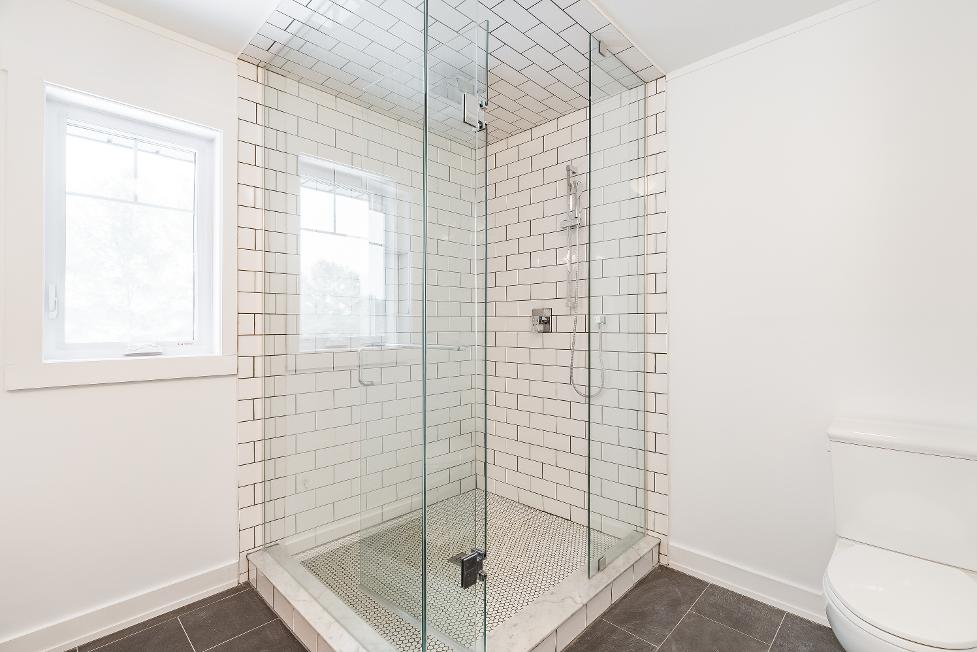 - Glass-walled shower accentuated bymosaic tile flooring,a subwaytilesurround, and a rainfallshowerhead