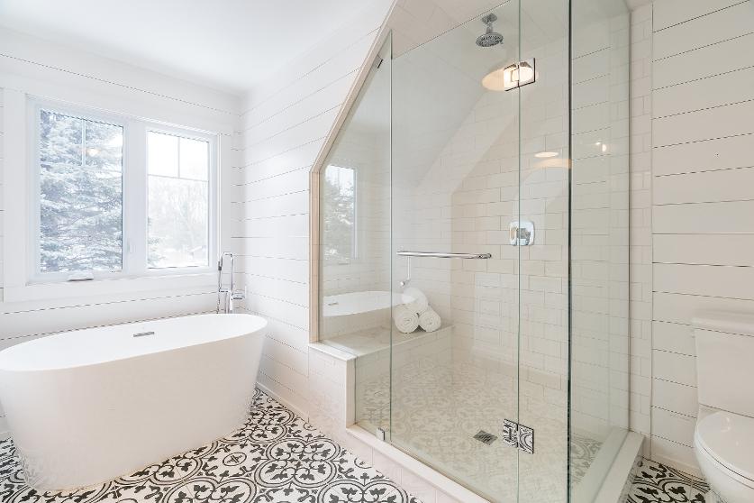 - Glass-walled showerfinished with a built-in bench and a sleektiled surround