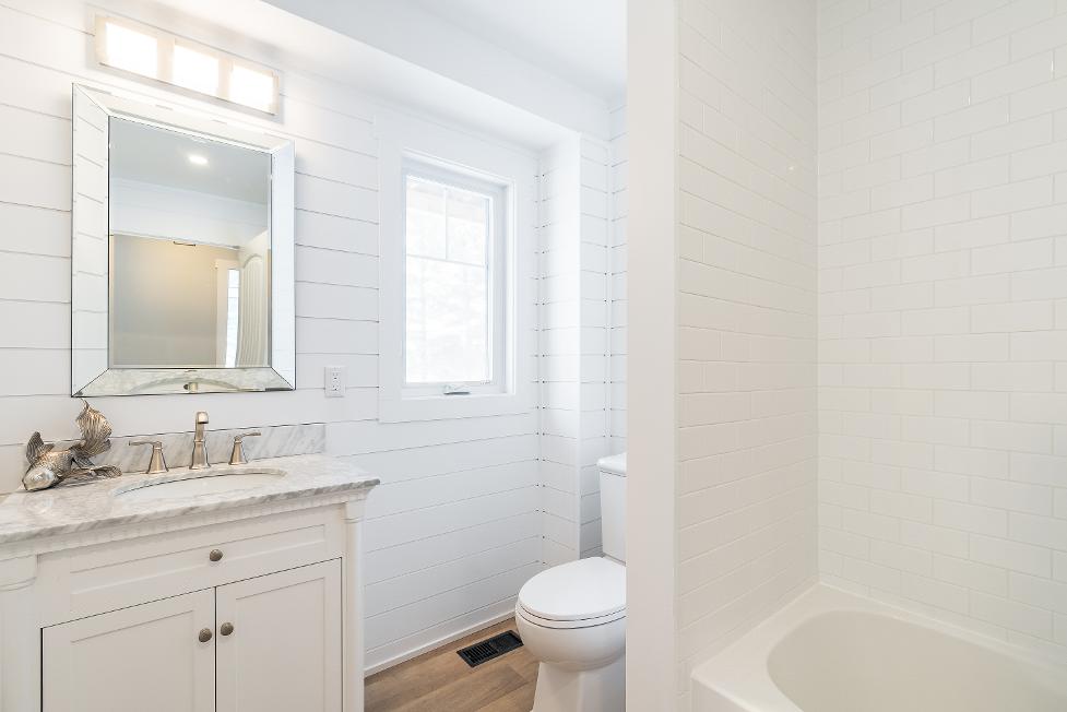 - Combined bathtub and shower with a subwaytilesurround and a built-in niche