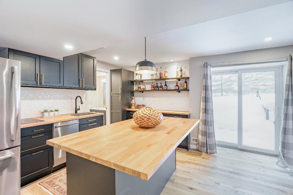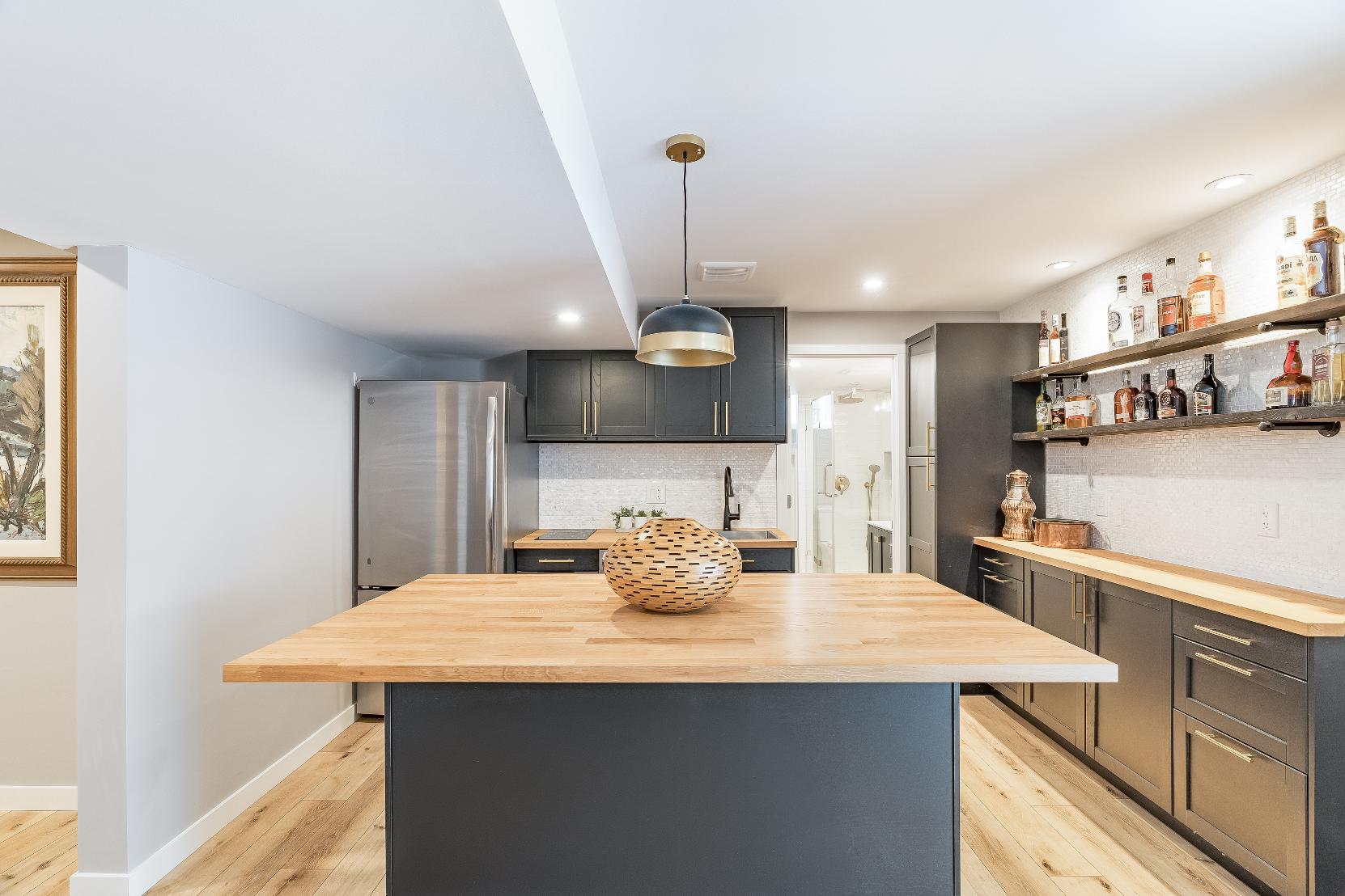 - Matte blackcabinetryaccompanied by butcher-blockcountertopsand a tiled backsplash