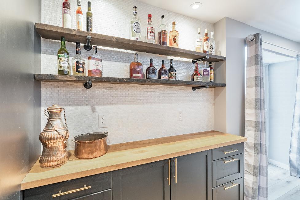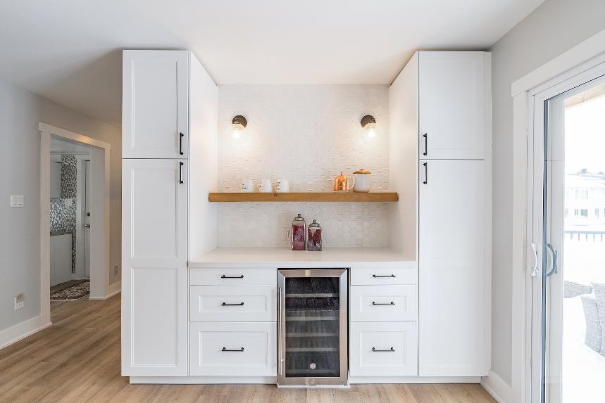 - Coffee barfeaturing a beveragefridge,an open-shelf,and tallcabinetsperfect for pantrystorage